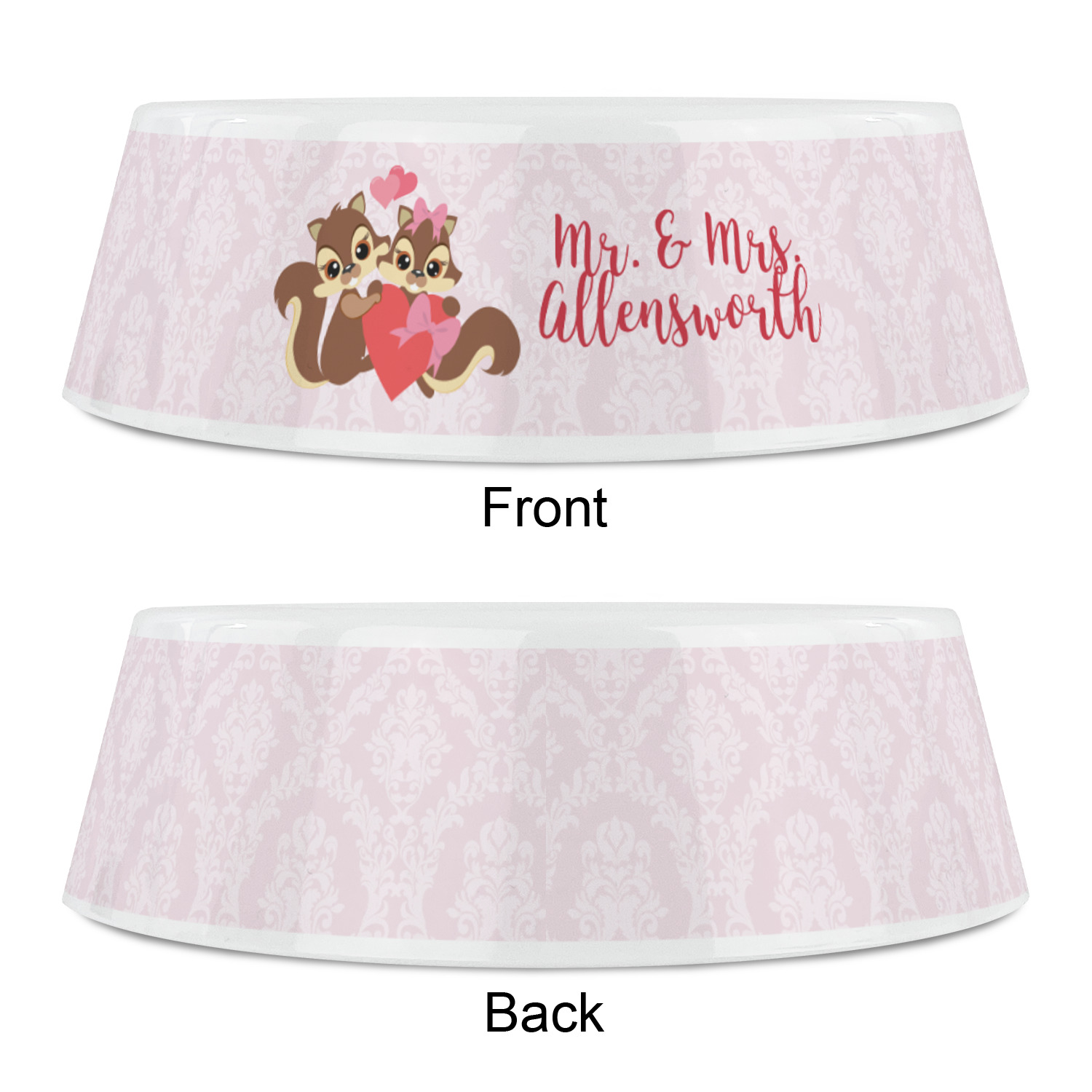 This Raccoon Couple Design is perfect for Valentine's Day or even for a newly engaged or married couple. It features a damask background in light pink with a raccoon couple in front holding hearts. The female has a bow on her head. There is a ribbon under the couple that can be customized with the couples names or even Mr. & Mrs. Your Text.