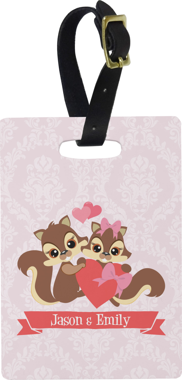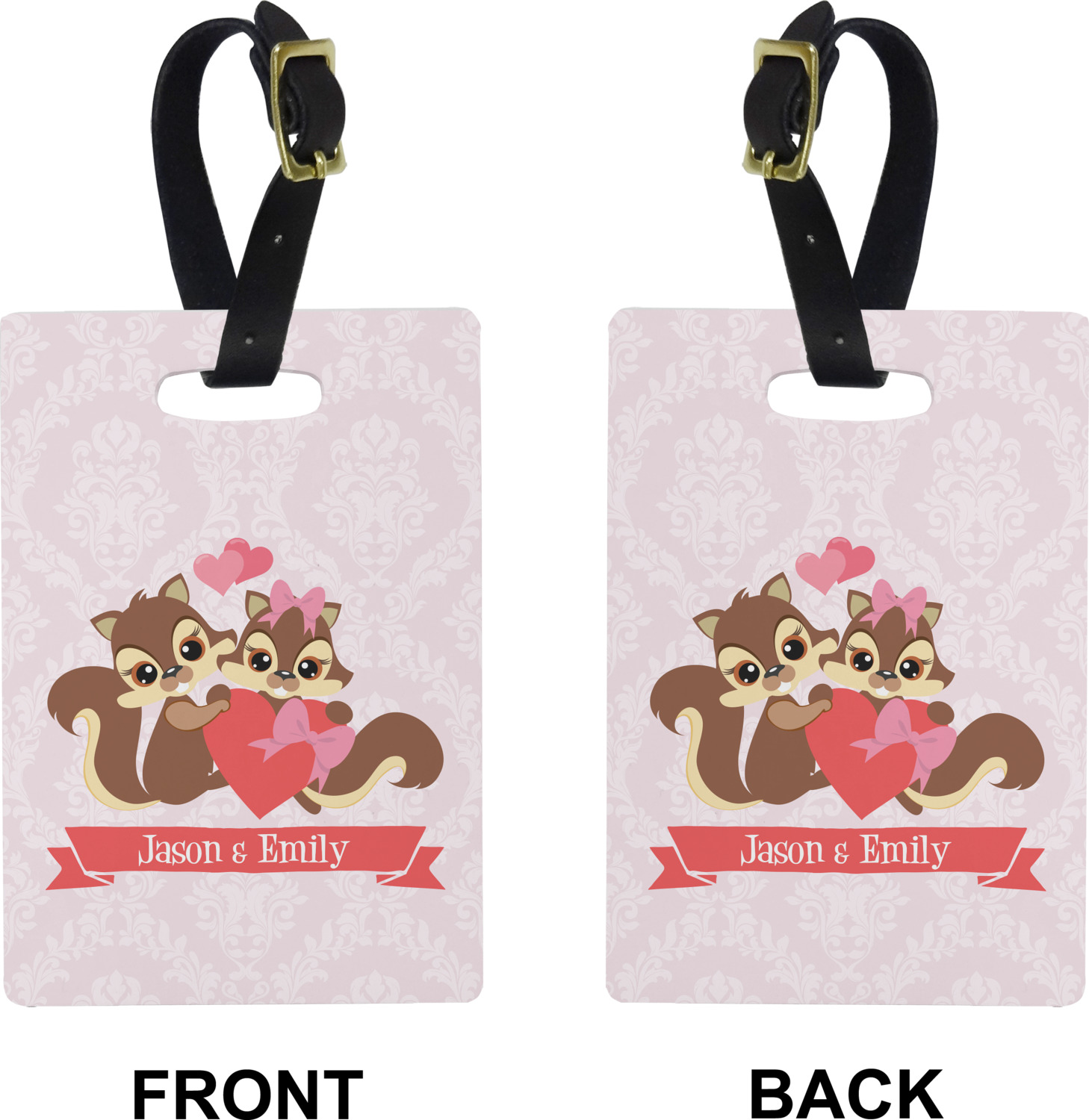 These personalized bag tags are sold in a variety of shapes, so that you may find the product that meets your vision exactly. We sell a round luggage tag, which measures at approximately 4" x 4". Our square luggage tag is about 3.5" x 3.5", while our rectangular version is 2.75" x 4 ".