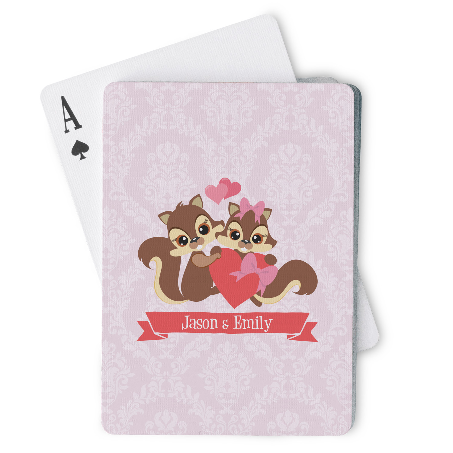 The customization / personalization is printed on the back side. The playing cards have a low gloss coating on both sides. The cards are packaged in a clear plastic box.