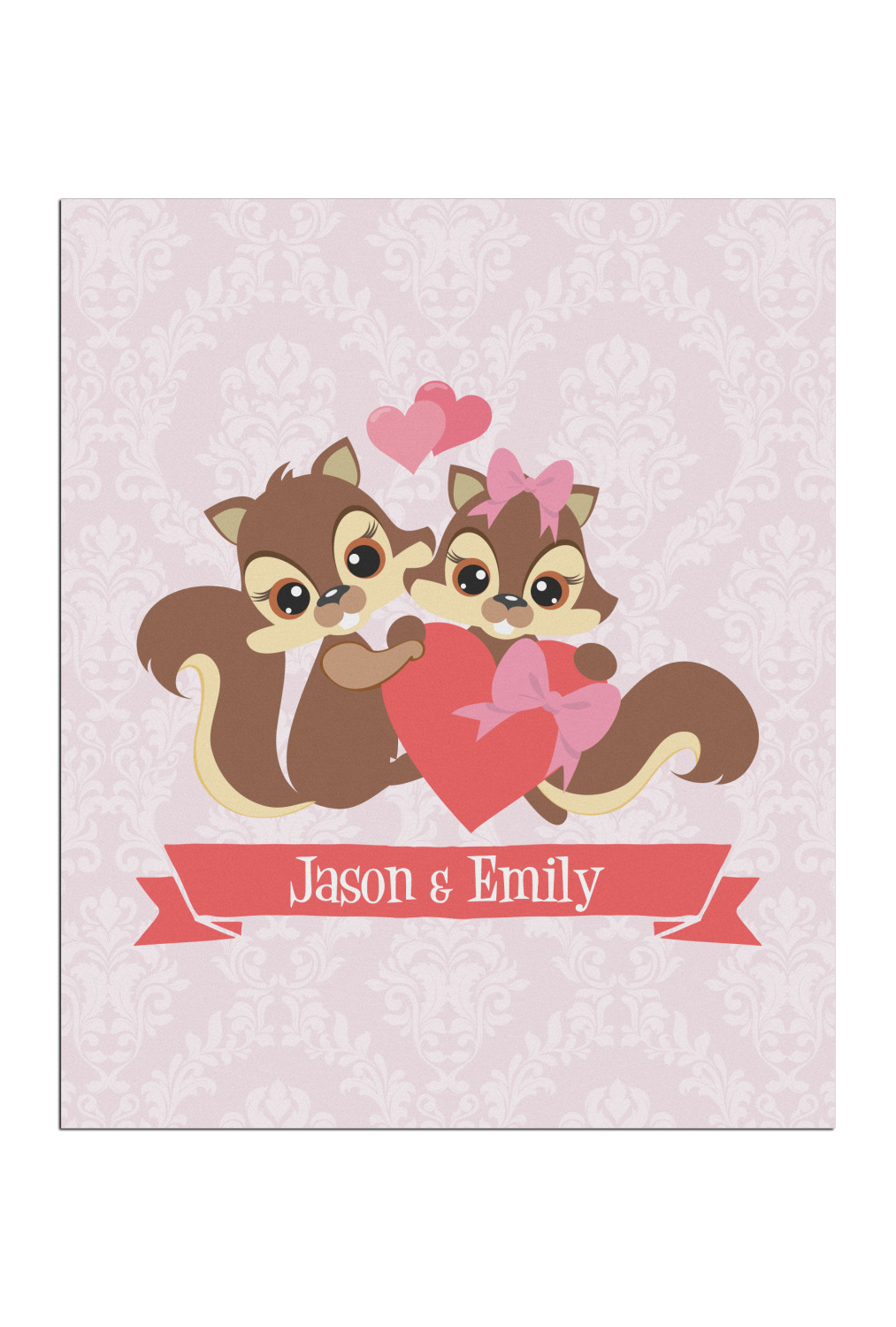 This Raccoon Couple Design is perfect for Valentine's Day or even for a newly engaged or married couple. It features a damask background in light pink with a raccoon couple in front holding hearts. The female has a bow on her head. There is a ribbon under the couple that can be customized with the couples names or even Mr. & Mrs. Your Text.