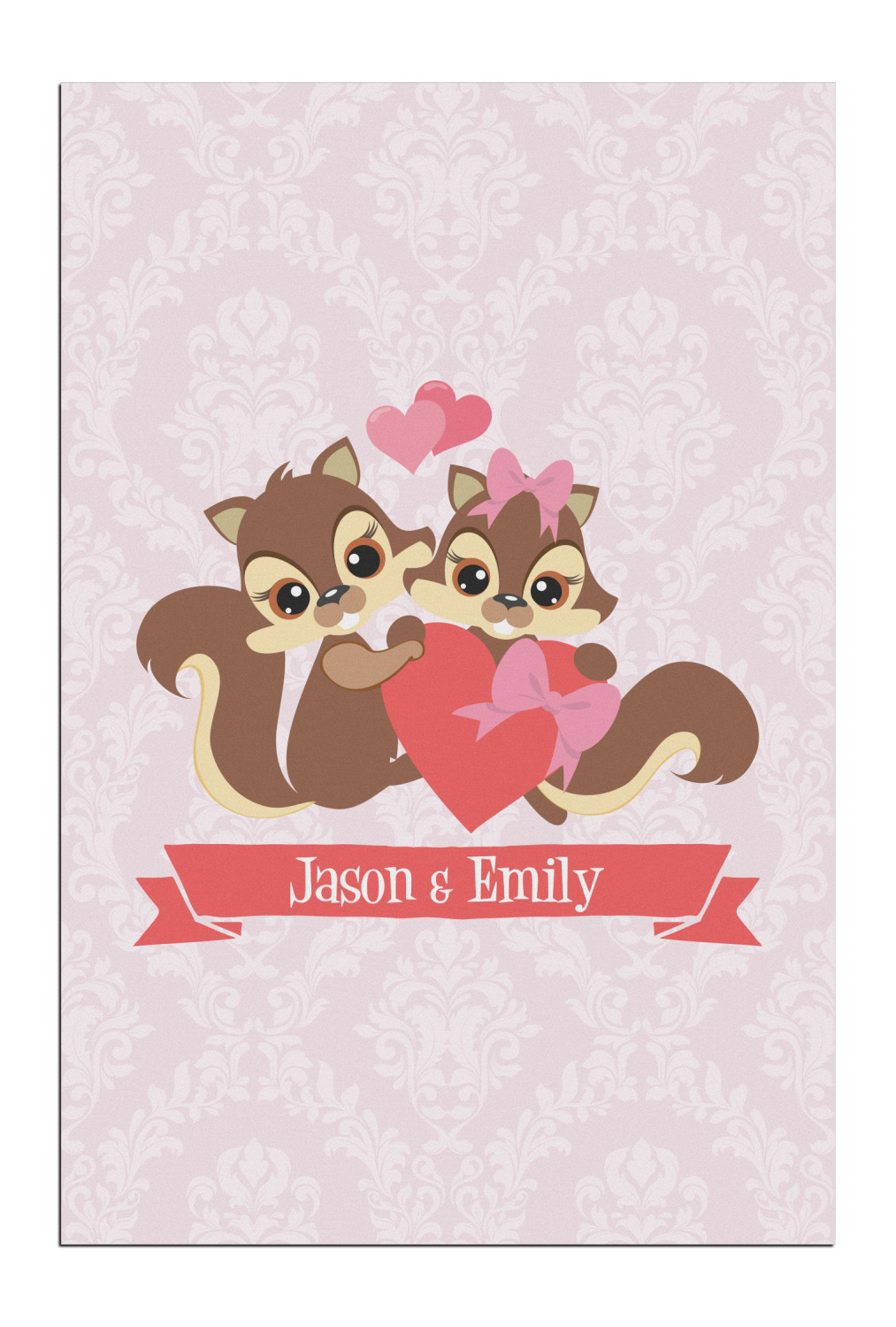 This Raccoon Couple Design is perfect for Valentine's Day or even for a newly engaged or married couple. It features a damask background in light pink with a raccoon couple in front holding hearts. The female has a bow on her head. There is a ribbon under the couple that can be customized with the couples names or even Mr. & Mrs. Your Text.