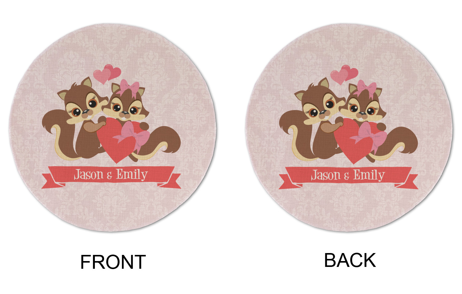 This Raccoon Couple Design is perfect for Valentine's Day or even for a newly engaged or married couple. It features a damask background in light pink with a raccoon couple in front holding hearts. The female has a bow on her head. There is a ribbon under the couple that can be customized with the couples names or even Mr. & Mrs. Your Text.
