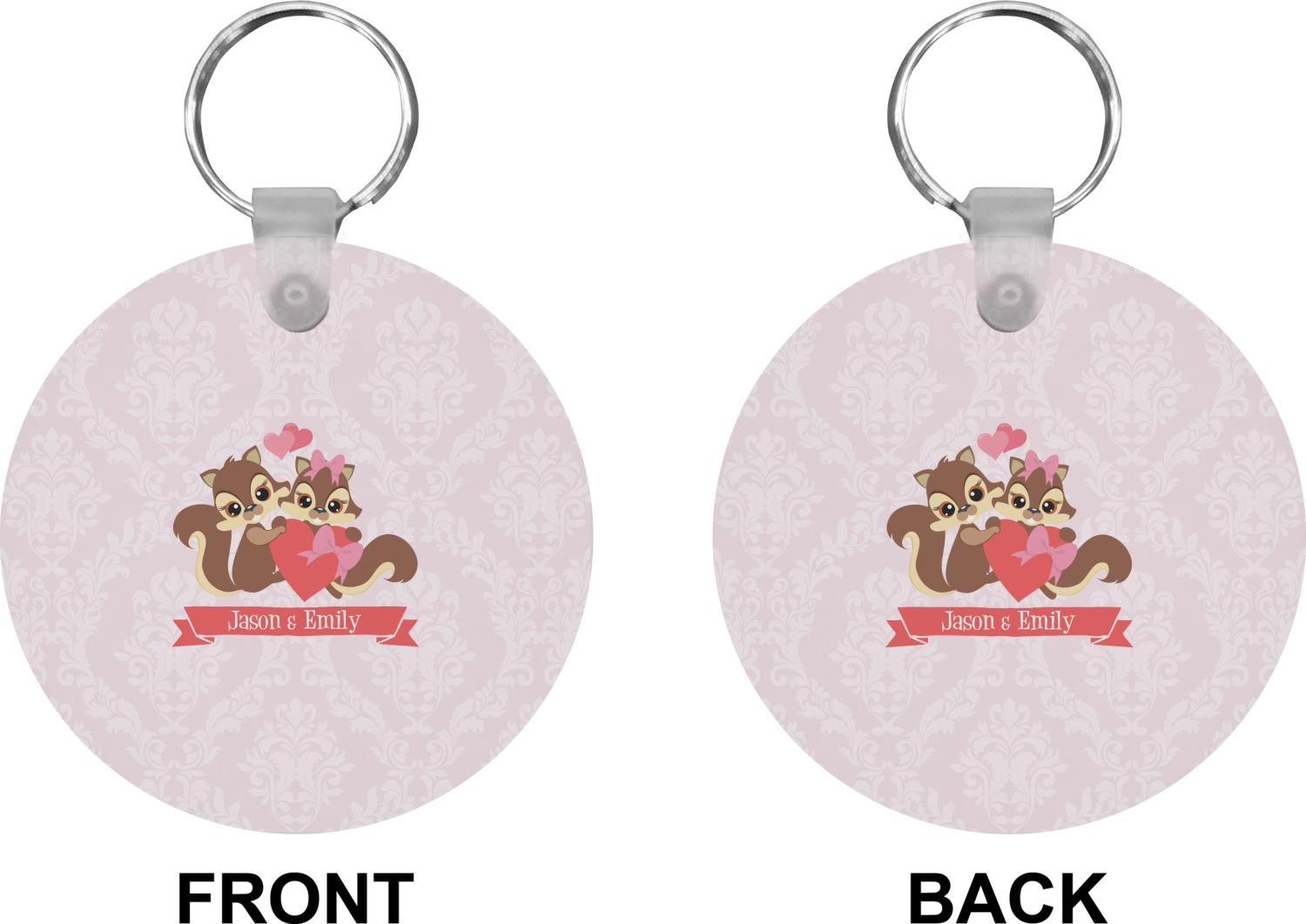 Our personalized keychains attach to the included metal, split key ring with a plastic, removable snap. Since a metal ring is included with your purchase, you have the liberty to keep your keys together on the ring, with or without your unique keychain. We offer this keychain in three different shapes: circle, heart, or diamond. We print your personalized design(s) on both sides of the key chain, and the surface has a glossy, reflective finish that only emphasizes your design. Each keychain is approximately 2.25 by 2.25 inches.