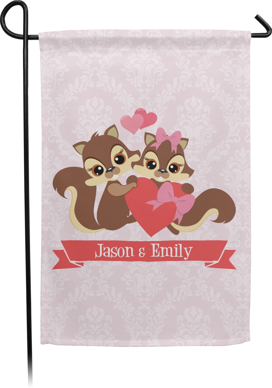 These custom garden flags are made of a durable, double-ply, polyester weave, allowing them to withstand the elements year round. The small flags measure at approximately 12 by 18 inches. The large flags measure out to 28 by 37 inches. You can order these decorative flags with your customization printed on the front only, or the front and back.