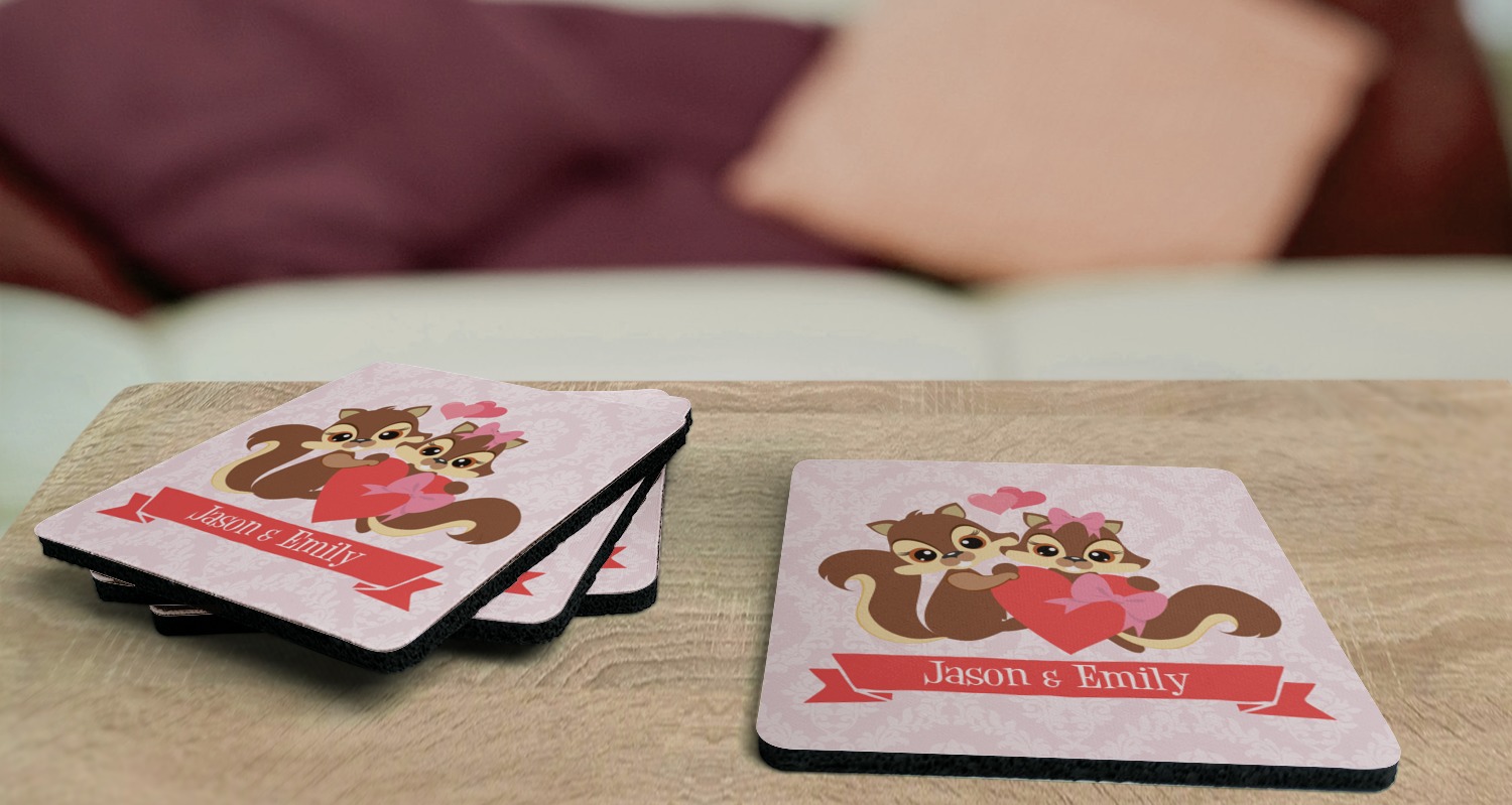 These drink coasters have a smooth, polyester top and a textured, rubber backing on its bottom. The non-slip rubber backing underneath works to keep any spills at bay. At 4 by 4 by 0.25 inches thick, these custom coasters are a suitable size for most drinkware. Your personalization is displayed atop the face of the cup coaster. We sell these rubber coasters in two different shapes: square and round. You can buy each shape as singulars or as a set of 4.
