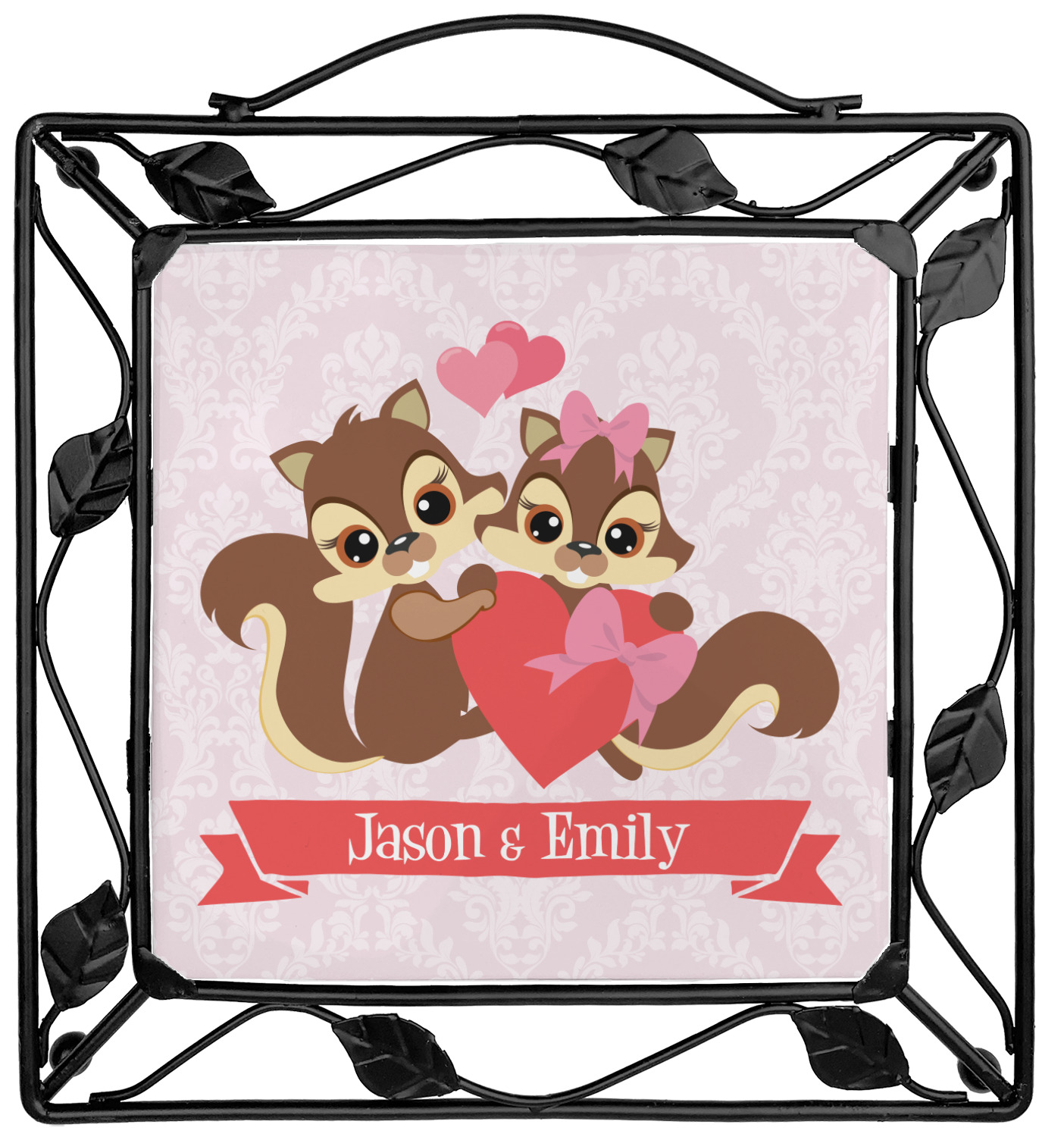 Our square trivets are made from a durable, wrought iron. This model features 4 small half circles, one on each corner, and a larger ring of iron that circles the central, customized tile. Each of the 4 corners has a round foot on its bottom for stability. This trivet is 8.75 by 8.75 inches, but the central tile measures at 6 inches on both sides.