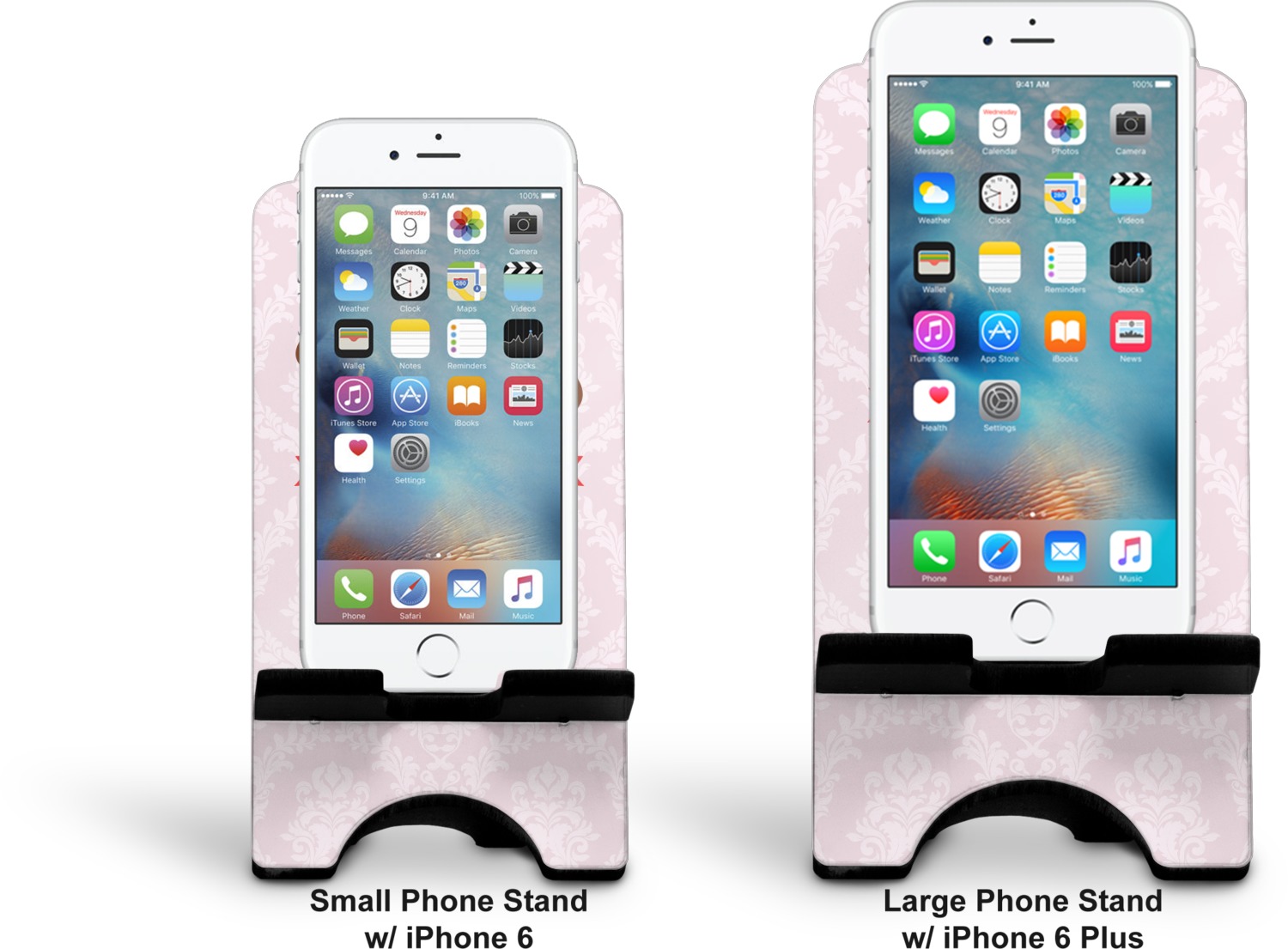 To meet your needs, we offer four variations of this IPhone stand. The backboard of the first version is shaped as a plain, yet sleek rectangle, and is available in two sizes. Our smaller size is approximately 4 by 3.25 by 7 inches, while the larger model is 4 by 3.77 by 8.5 inches. Alongside this model, we also provide you with a more decorative option. The upper part of our second version features a curved edge, for a classy, suave appearance. This phone holder is also sold in two sizes: a smaller version, which is 4 by 3.25 by 7 inches, and our larger model, which is 4 by 3.77 by 8.5 inches. Both models will support large phones, but the larger model is better if you wish to proudly display your personalized design.
