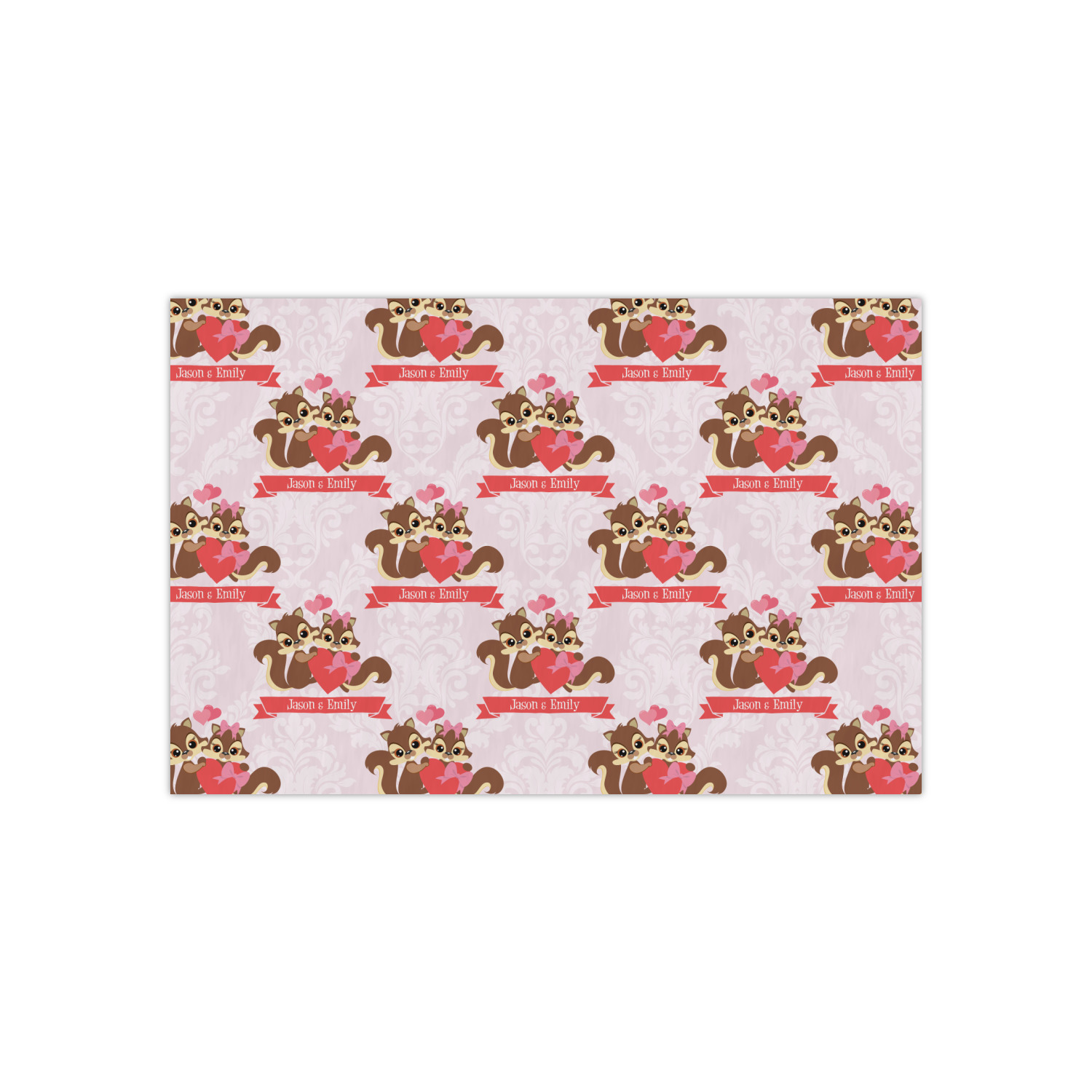 This Raccoon Couple Design is perfect for Valentine's Day or even for a newly engaged or married couple. It features a damask background in light pink with a raccoon couple in front holding hearts. The female has a bow on her head. There is a ribbon under the couple that can be customized with the couples names or even Mr. & Mrs. Your Text.