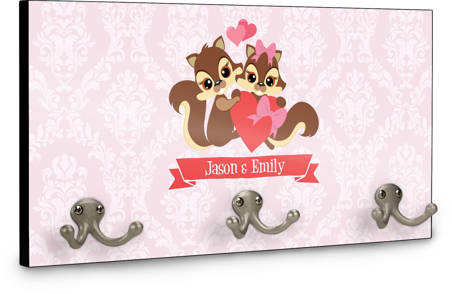 This coat rack is the perfect way to add some personality to your wall or entryway. The board is made of a strong maple that is approximately 16" x 8". The three 2-prong hooks are a sturdy metal that have three screws attaching them to the board. Your design is printed right onto the front of the board while the back and sides are a simple black.