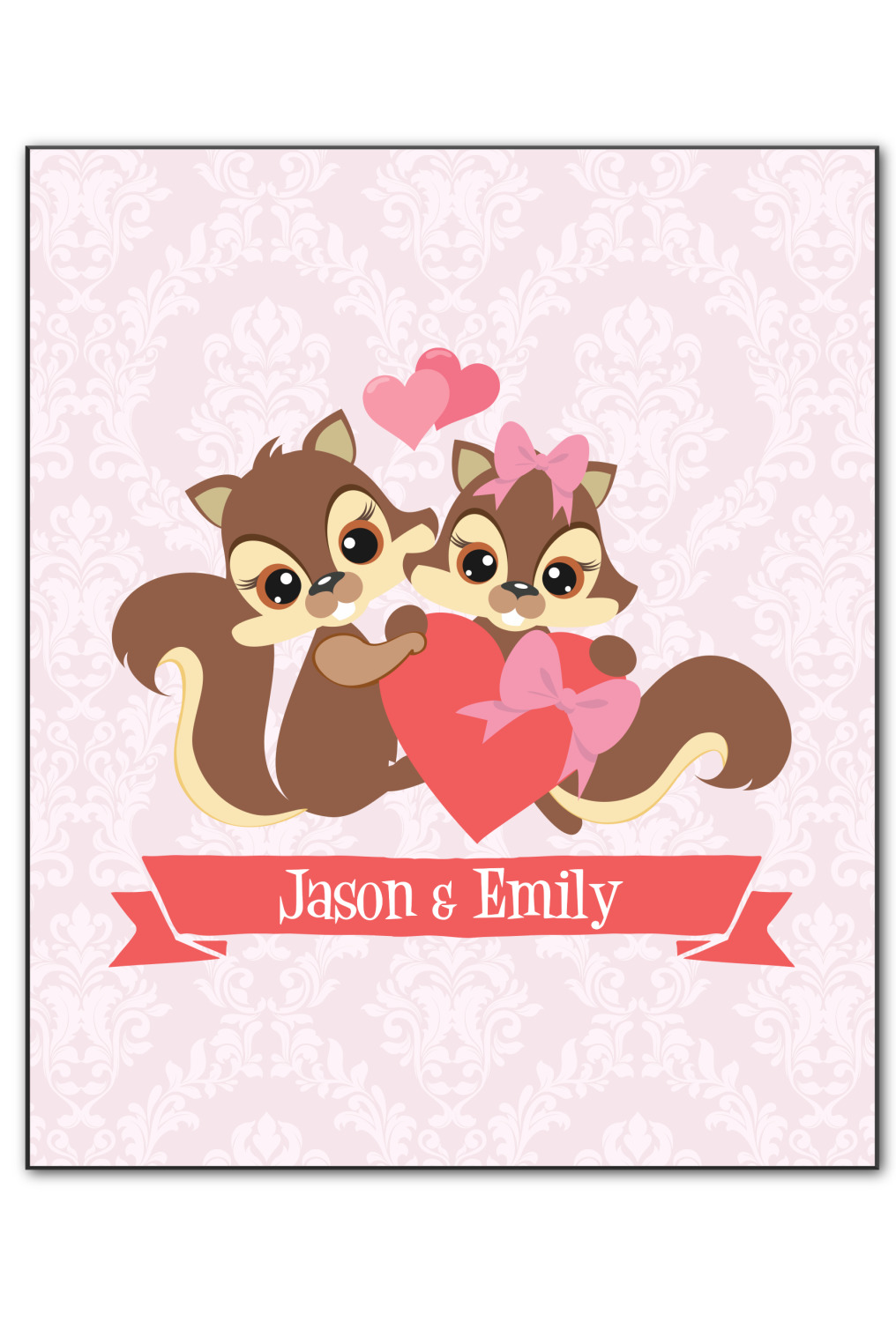This Raccoon Couple Design is perfect for Valentine's Day or even for a newly engaged or married couple. It features a damask background in light pink with a raccoon couple in front holding hearts. The female has a bow on her head. There is a ribbon under the couple that can be customized with the couples names or even Mr. & Mrs. Your Text.