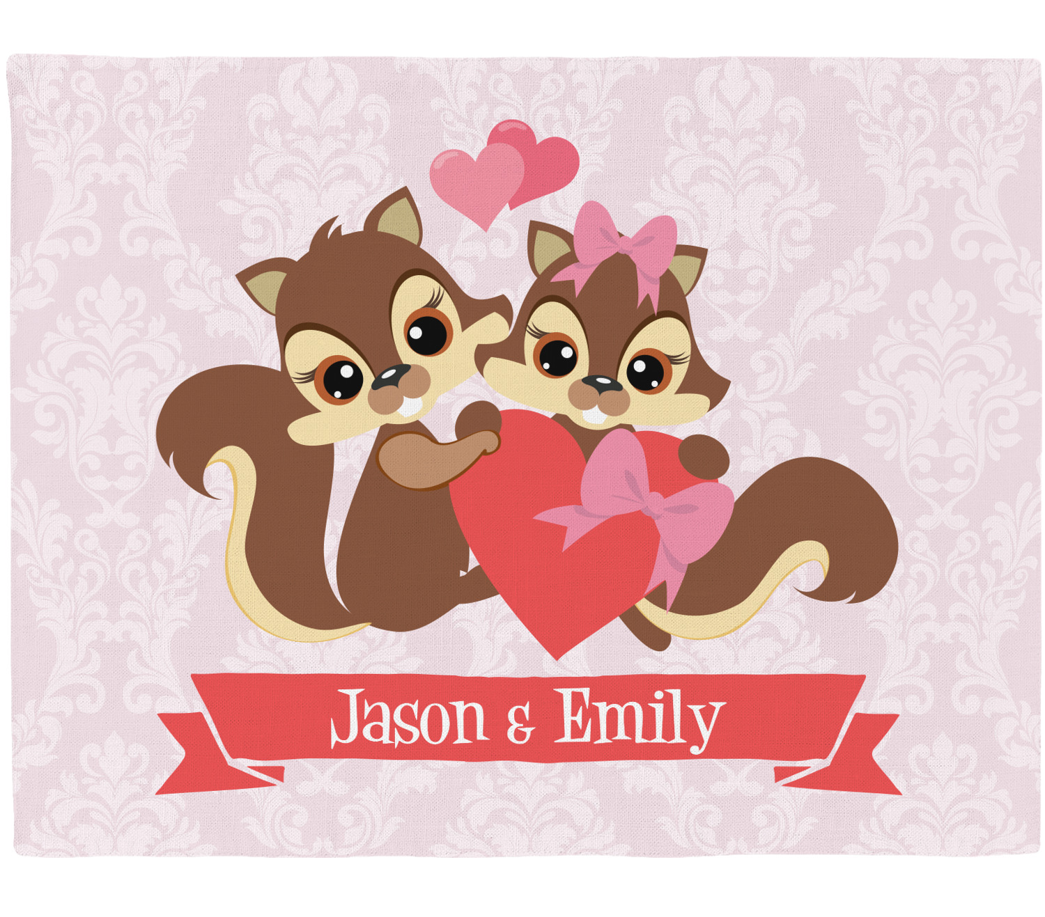 This Raccoon Couple Design is perfect for Valentine's Day or even for a newly engaged or married couple. It features a damask background in light pink with a raccoon couple in front holding hearts. The female has a bow on her head. There is a ribbon under the couple that can be customized with the couples names or even Mr. & Mrs. Your Text.