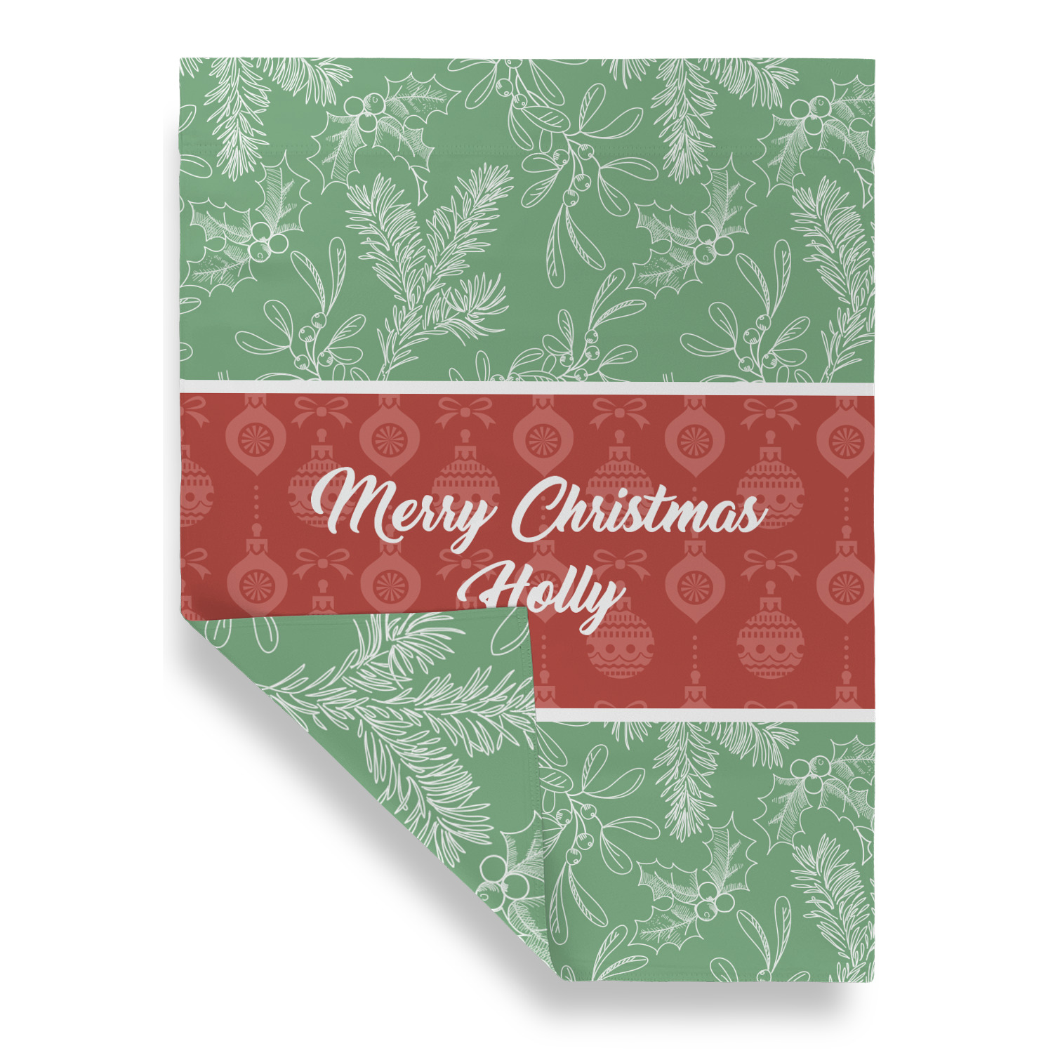 The design is divided into three horizontal parts. The top and bottom are a beautiful green holly background and the middle has a subtle red ornaments background. The middle section is where your personalization goes. This is a great design idea for Christmas decor or Christmas gifts.
