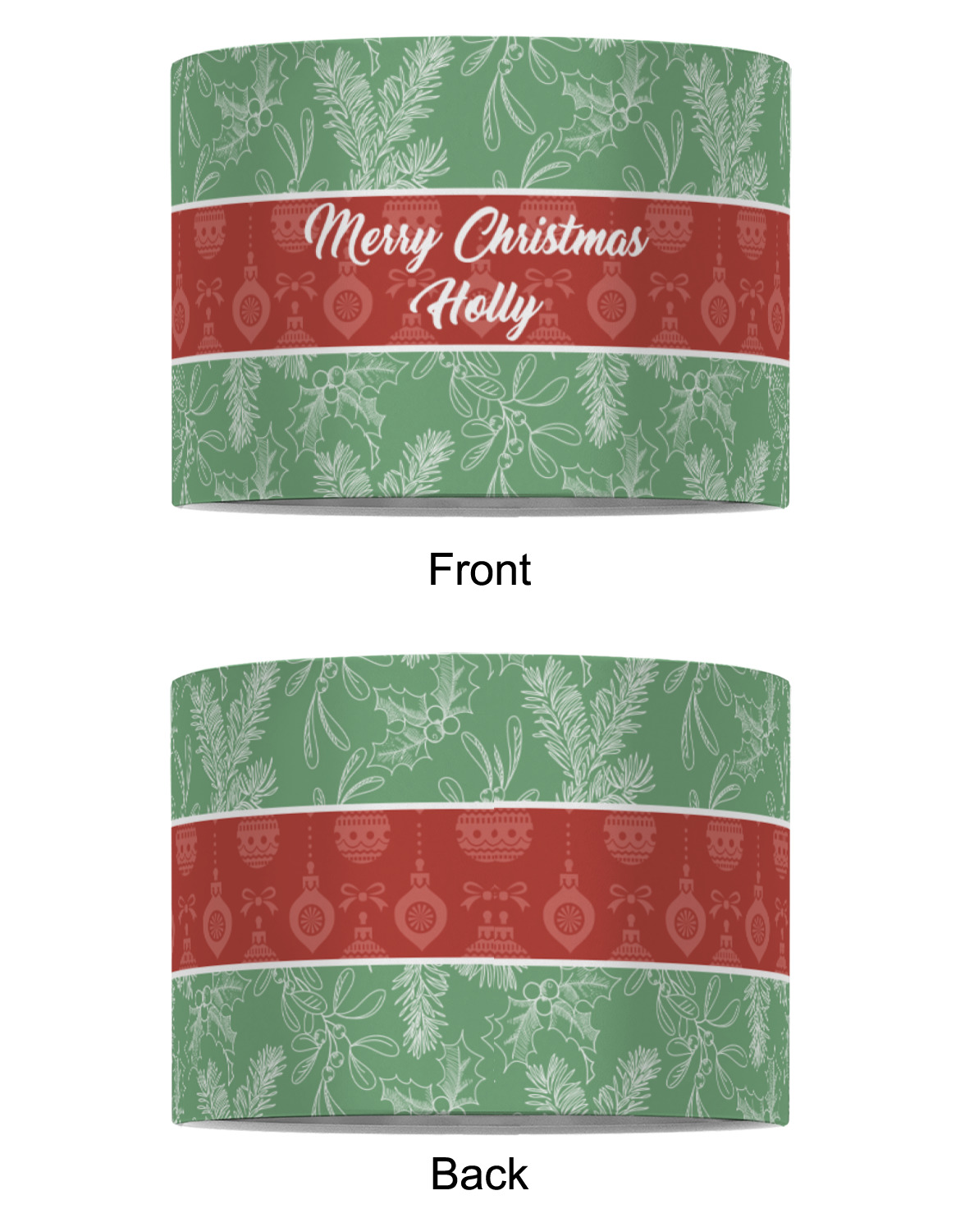 The design is divided into three horizontal parts. The top and bottom are a beautiful green holly background and the middle has a subtle red ornaments background. The middle section is where your personalization goes. This is a great design idea for Christmas decor or Christmas gifts.