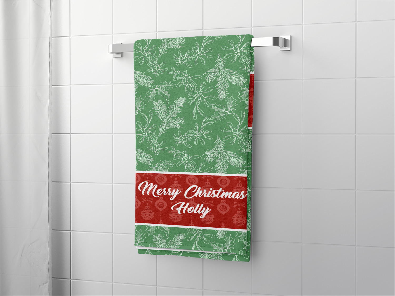 The design is divided into three horizontal parts. The top and bottom are a beautiful green holly background and the middle has a subtle red ornaments background. The middle section is where your personalization goes. This is a great design idea for Christmas decor or Christmas gifts.