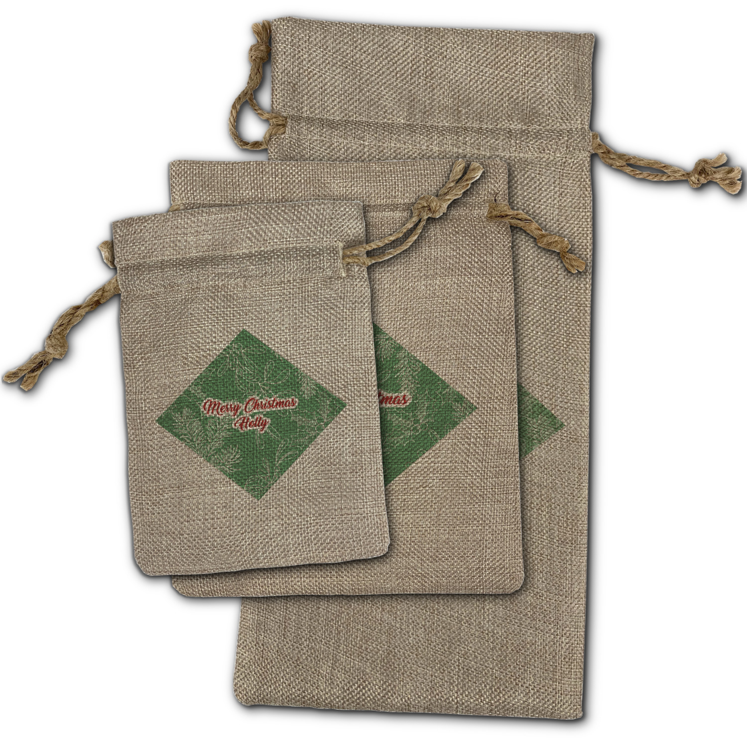 We sell our Burlap Gift Bags in 3 variant sized bags. Made with burlap polyester, each personalized bag can be secured with a twine drawstring pull. Your custom design is available to print on one side or both sides - completely up to you! The sizes of the bags measure approximately 4.5" x 6.5" for the smallest size, 6.5" x 8.0" for the medium size, and 6.5" x 13.5" for the large-sized bag.
