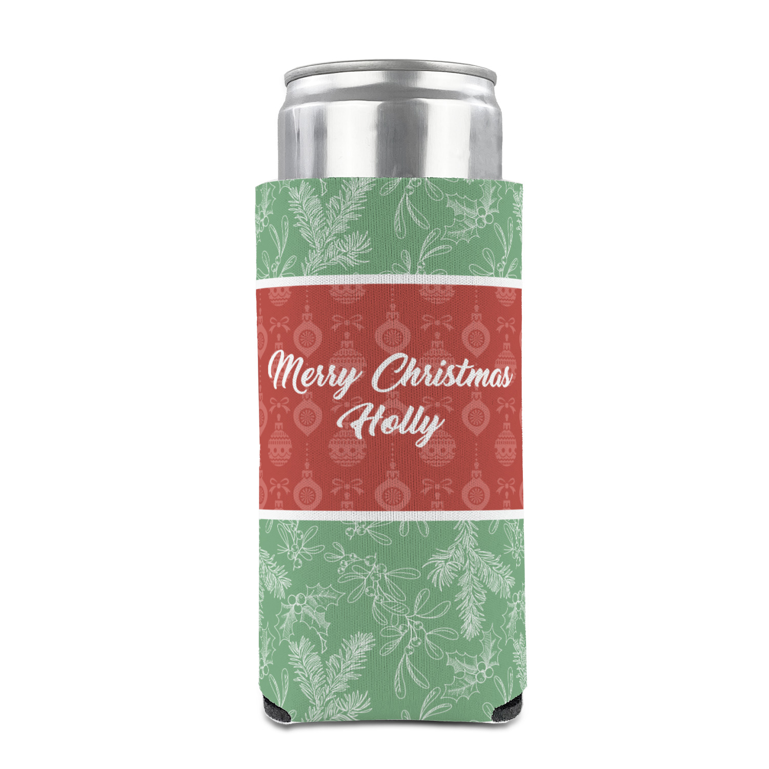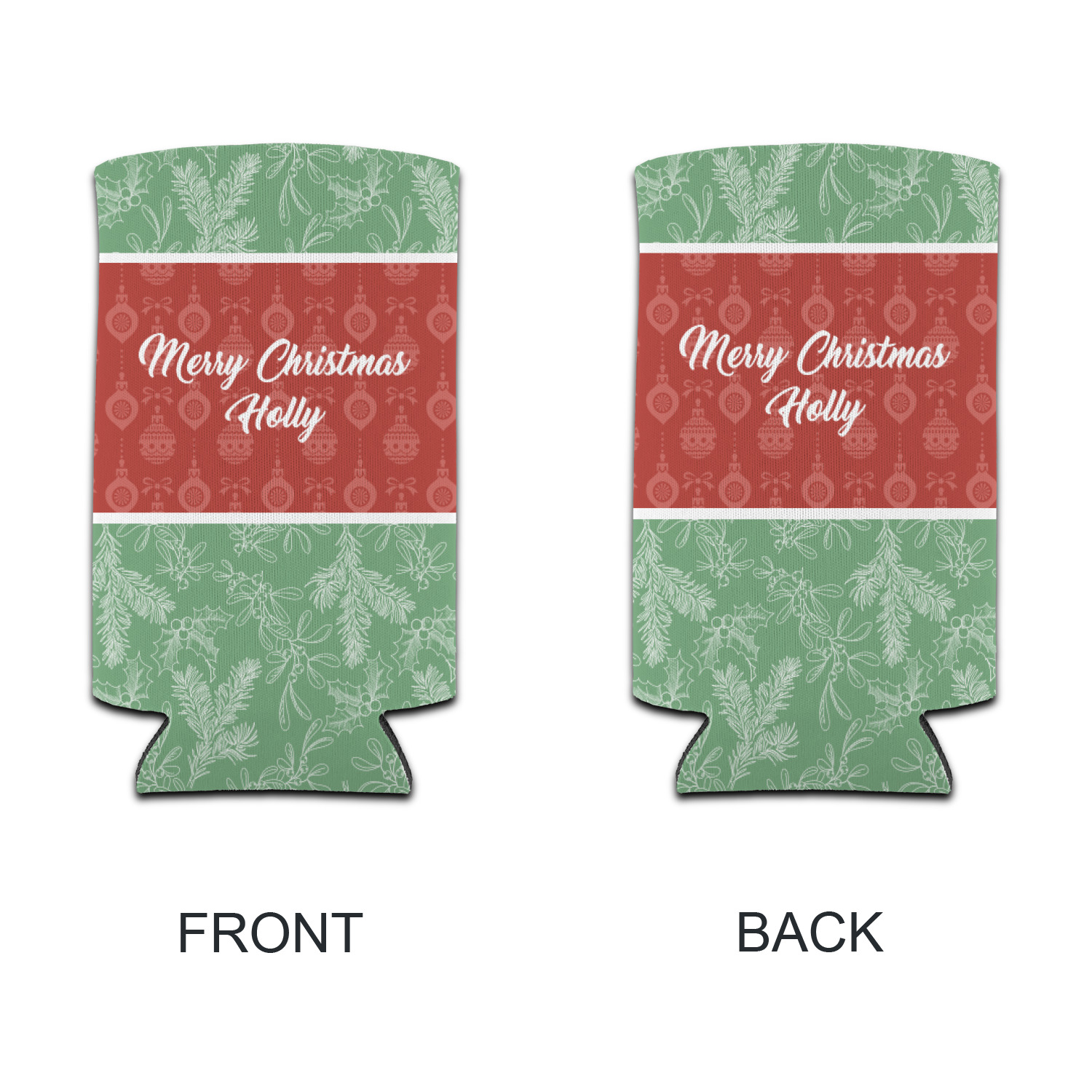 The design is divided into three horizontal parts. The top and bottom are a beautiful green holly background and the middle has a subtle red ornaments background. The middle section is where your personalization goes. This is a great design idea for Christmas decor or Christmas gifts.