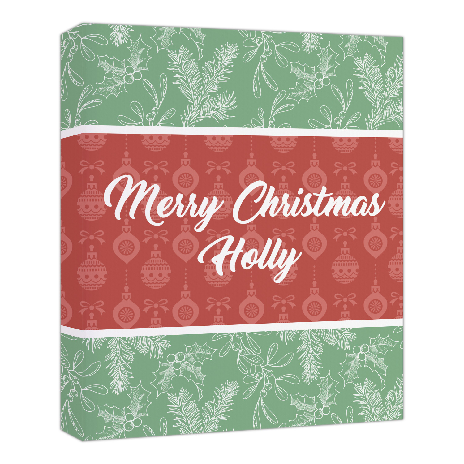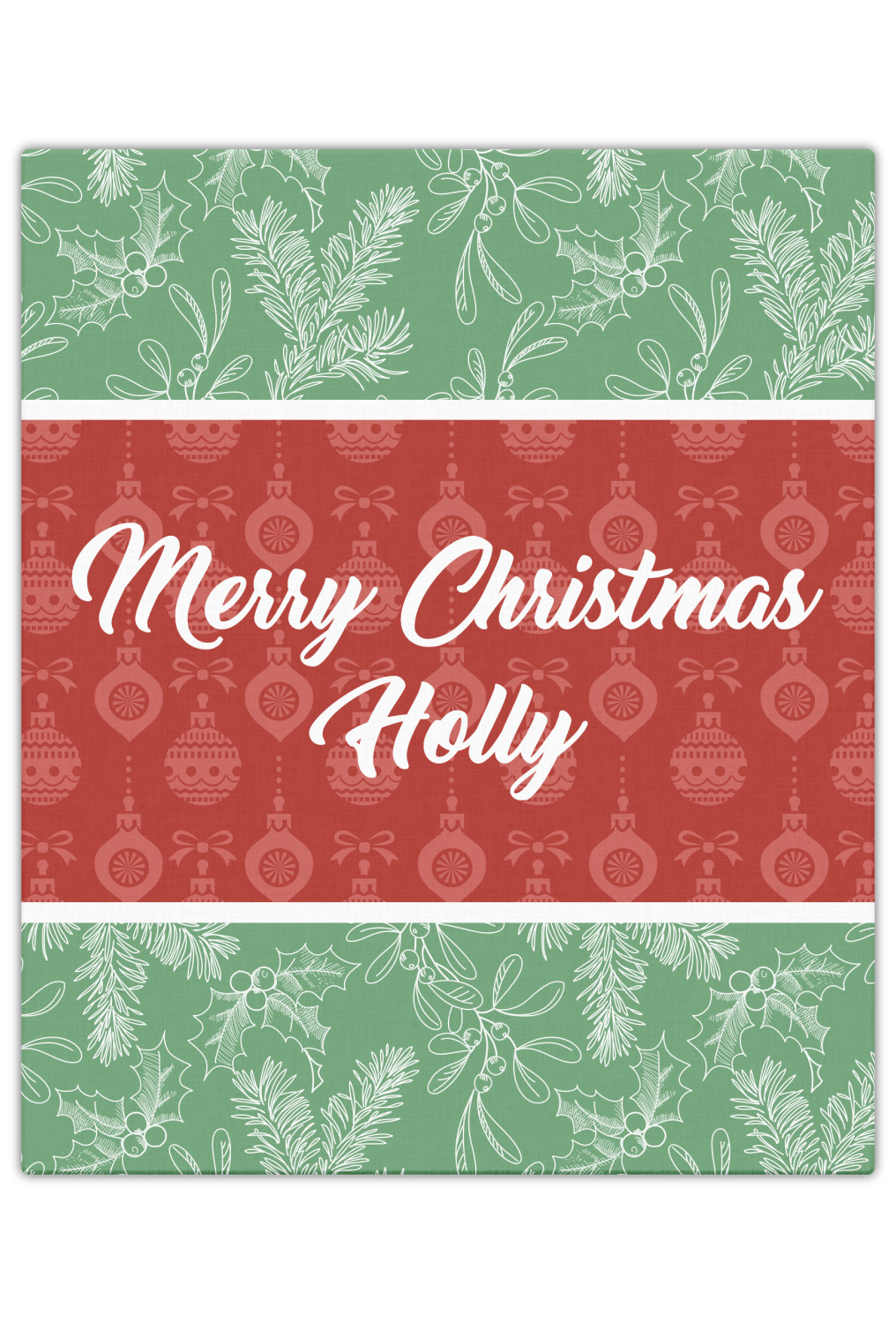 The design is divided into three horizontal parts. The top and bottom are a beautiful green holly background and the middle has a subtle red ornaments background. The middle section is where your personalization goes. This is a great design idea for Christmas decor or Christmas gifts.