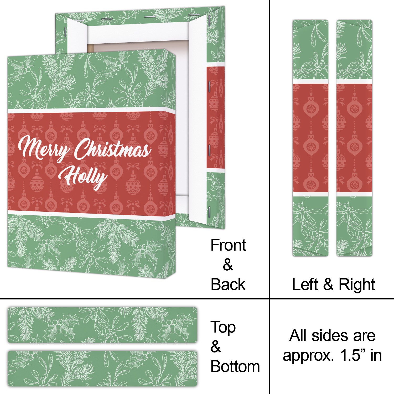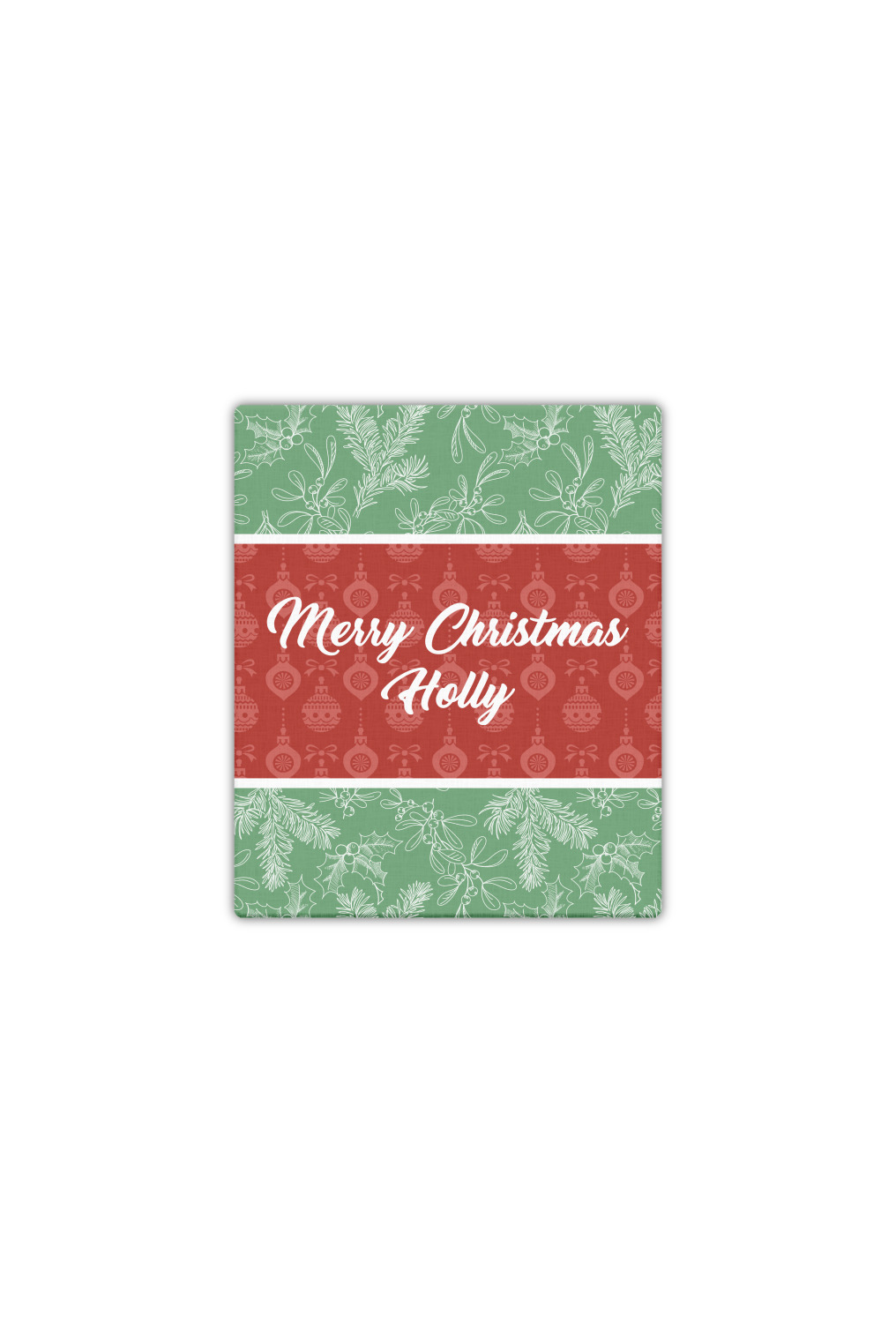 The design is divided into three horizontal parts. The top and bottom are a beautiful green holly background and the middle has a subtle red ornaments background. The middle section is where your personalization goes. This is a great design idea for Christmas decor or Christmas gifts.