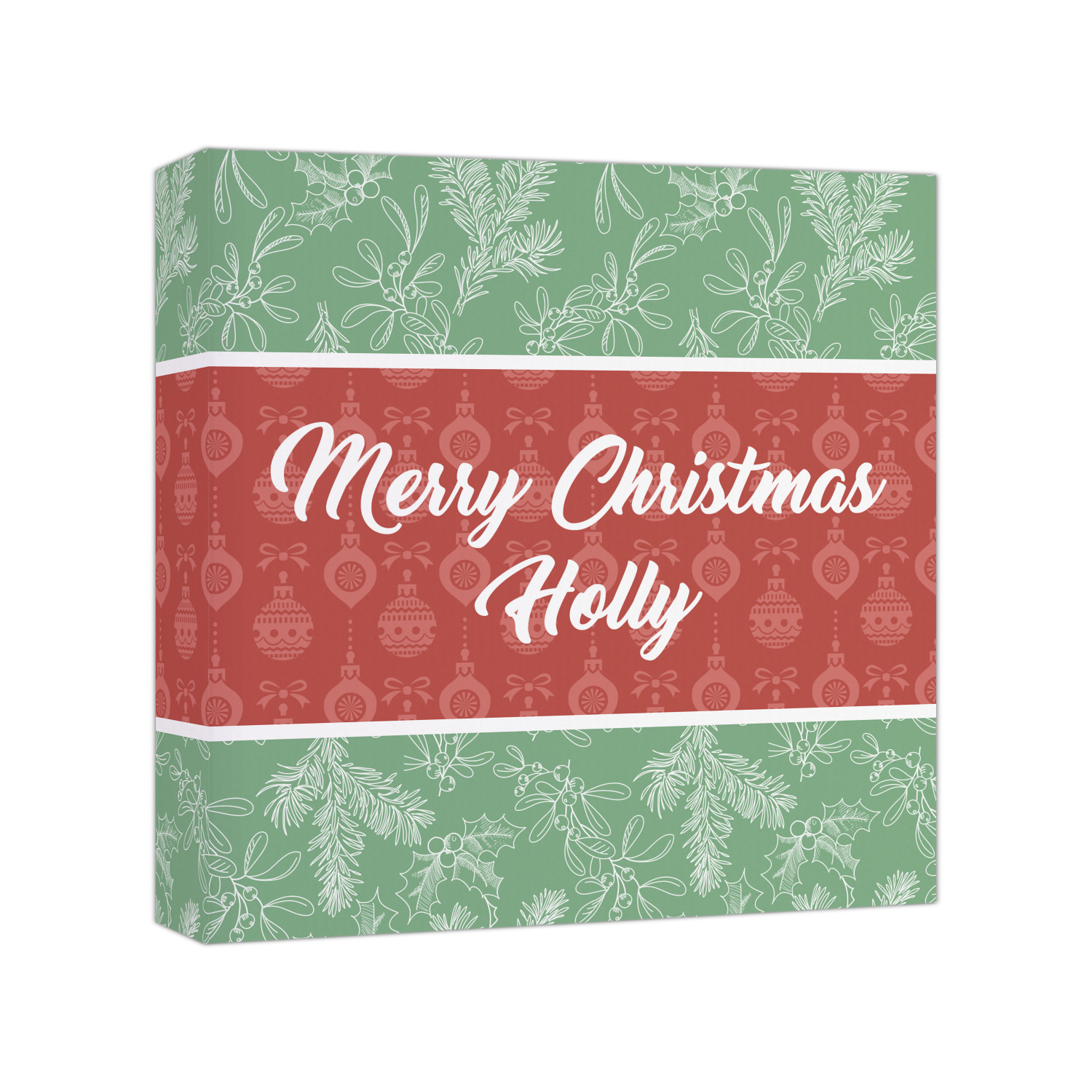 The design is divided into three horizontal parts. The top and bottom are a beautiful green holly background and the middle has a subtle red ornaments background. The middle section is where your personalization goes. This is a great design idea for Christmas decor or Christmas gifts.