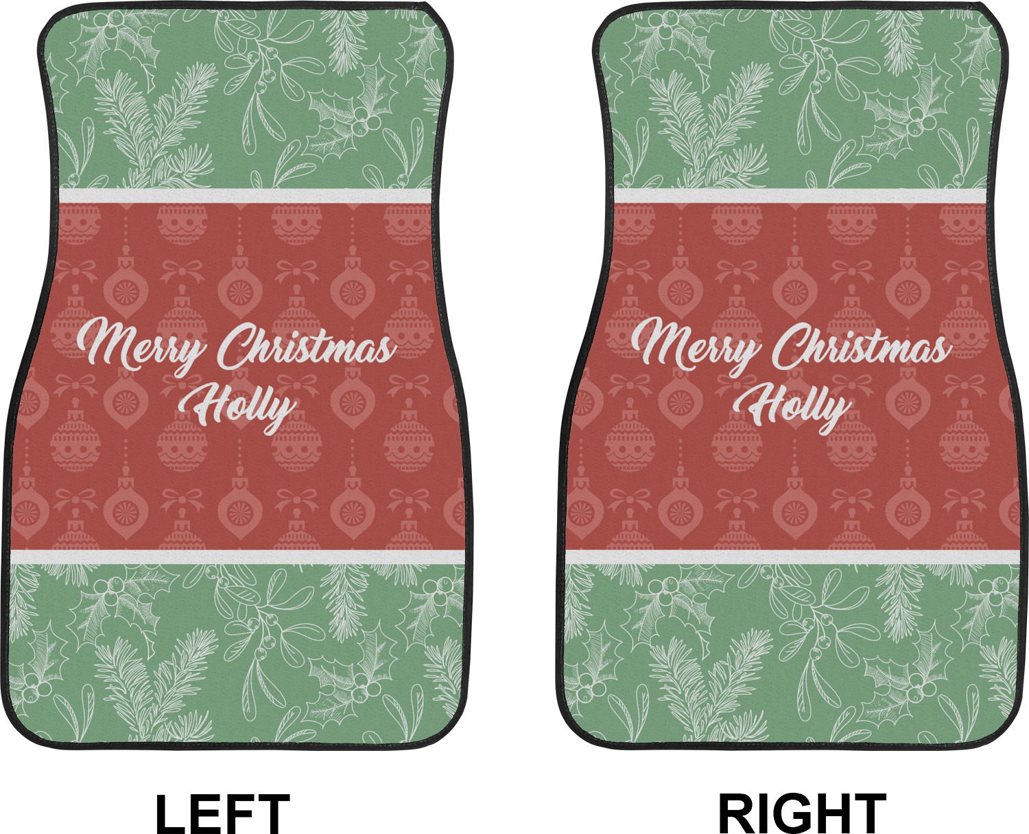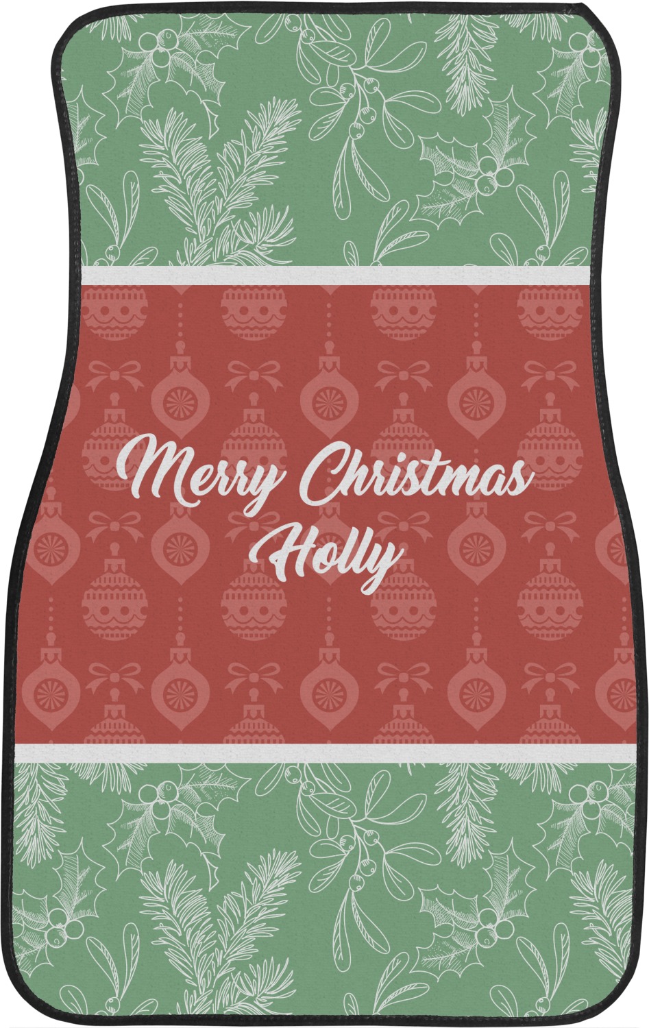 The design is divided into three horizontal parts. The top and bottom are a beautiful green holly background and the middle has a subtle red ornaments background. The middle section is where your personalization goes. This is a great design idea for Christmas decor or Christmas gifts.