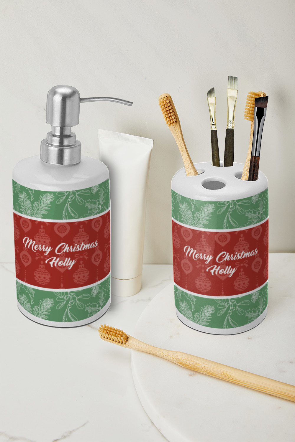 The design is divided into three horizontal parts. The top and bottom are a beautiful green holly background and the middle has a subtle red ornaments background. The middle section is where your personalization goes. This is a great design idea for Christmas decor or Christmas gifts.