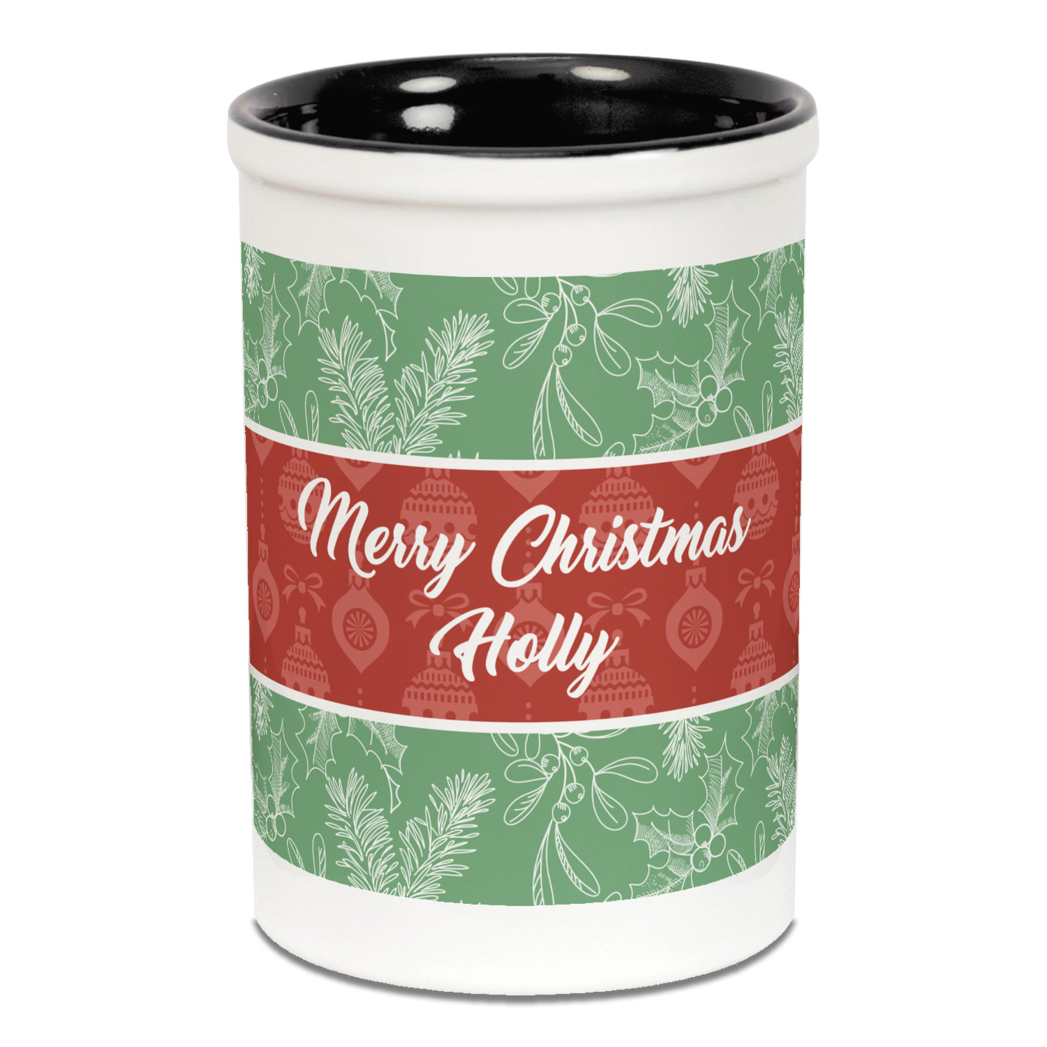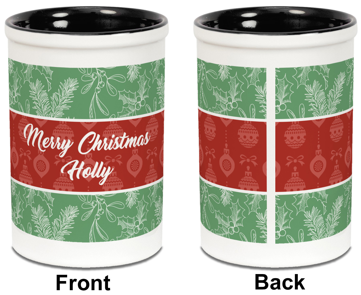 The design is divided into three horizontal parts. The top and bottom are a beautiful green holly background and the middle has a subtle red ornaments background. The middle section is where your personalization goes. This is a great design idea for Christmas decor or Christmas gifts.