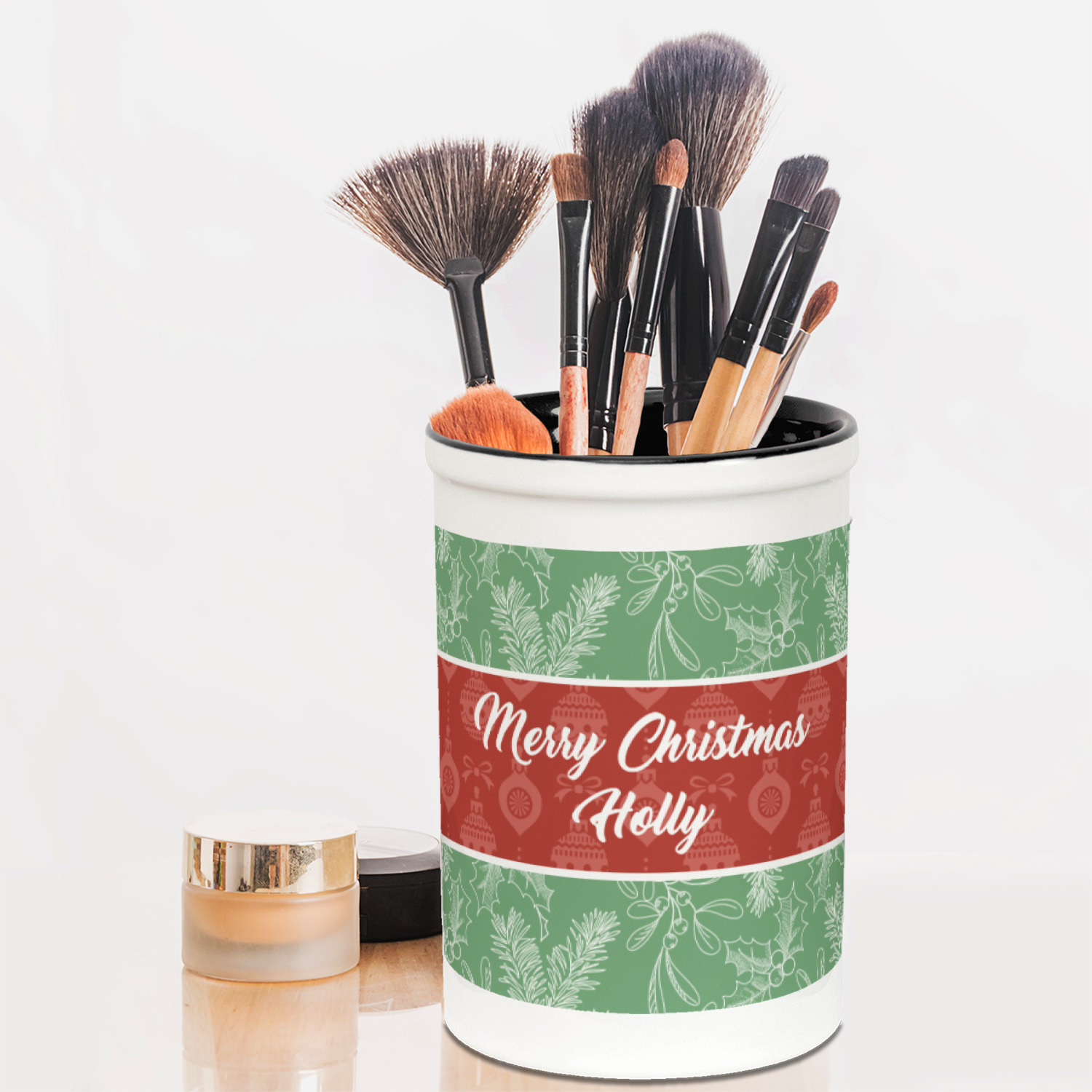 The design is divided into three horizontal parts. The top and bottom are a beautiful green holly background and the middle has a subtle red ornaments background. The middle section is where your personalization goes. This is a great design idea for Christmas decor or Christmas gifts.