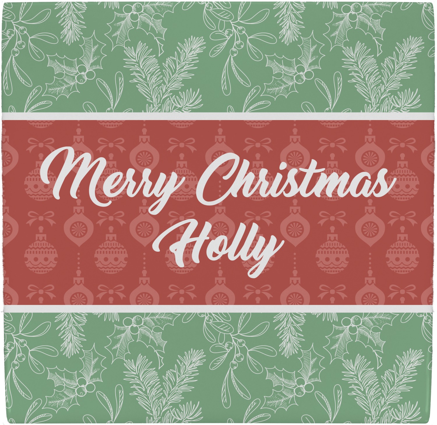 The design is divided into three horizontal parts. The top and bottom are a beautiful green holly background and the middle has a subtle red ornaments background. The middle section is where your personalization goes. This is a great design idea for Christmas decor or Christmas gifts.