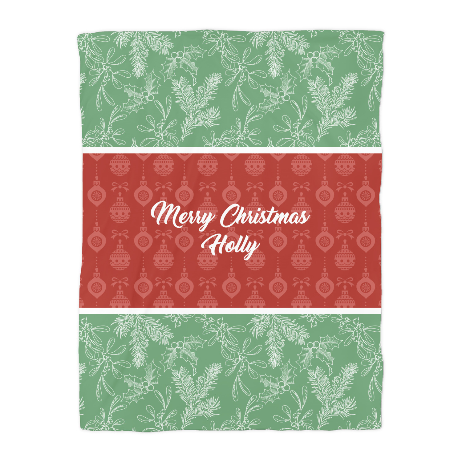 The design is divided into three horizontal parts. The top and bottom are a beautiful green holly background and the middle has a subtle red ornaments background. The middle section is where your personalization goes. This is a great design idea for Christmas decor or Christmas gifts.