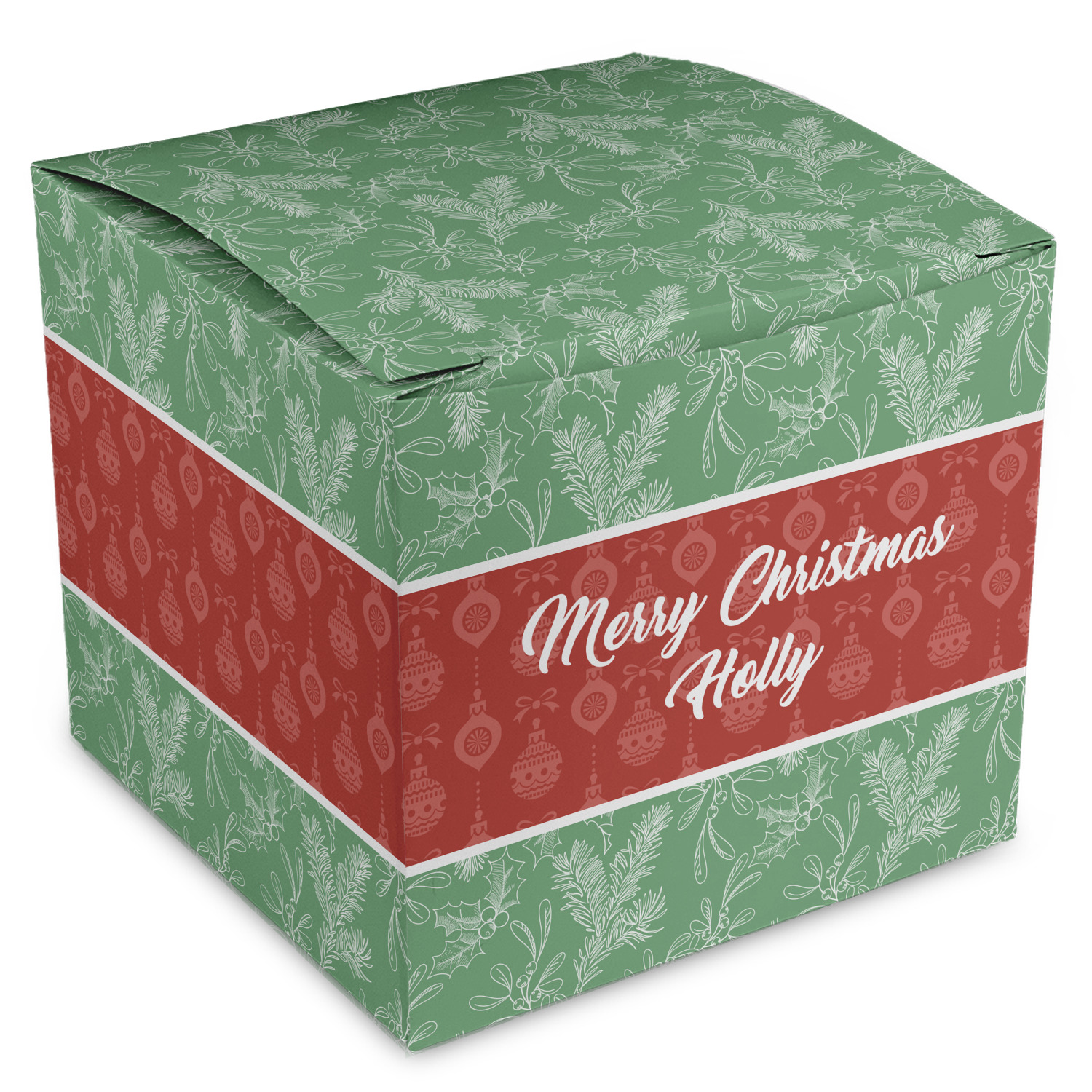 The design is divided into three horizontal parts. The top and bottom are a beautiful green holly background and the middle has a subtle red ornaments background. The middle section is where your personalization goes. This is a great design idea for Christmas decor or Christmas gifts.