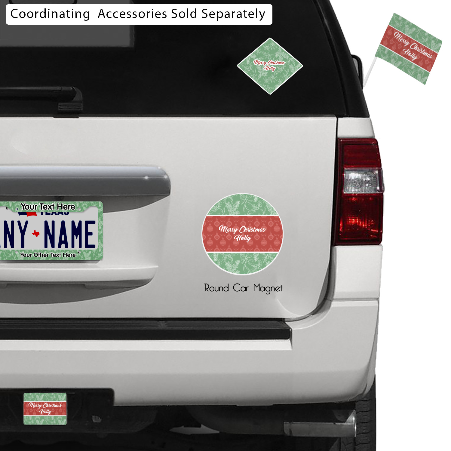 The design is divided into three horizontal parts. The top and bottom are a beautiful green holly background and the middle has a subtle red ornaments background. The middle section is where your personalization goes. This is a great design idea for Christmas decor or Christmas gifts.