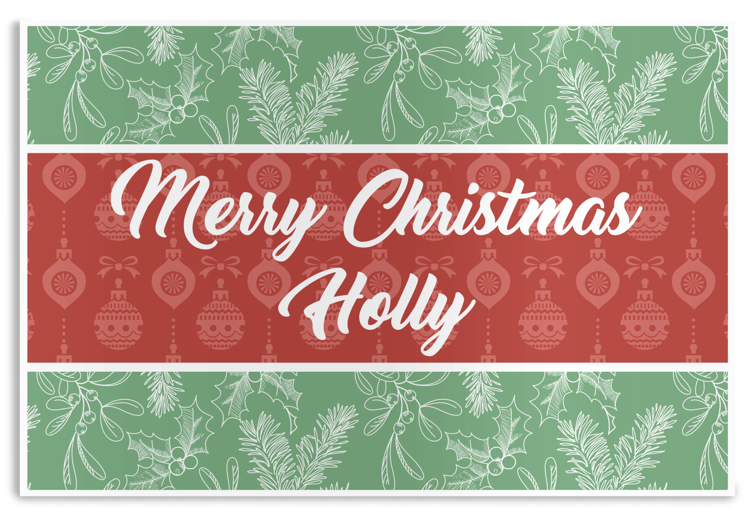 The design is divided into three horizontal parts. The top and bottom are a beautiful green holly background and the middle has a subtle red ornaments background. The middle section is where your personalization goes. This is a great design idea for Christmas decor or Christmas gifts.
