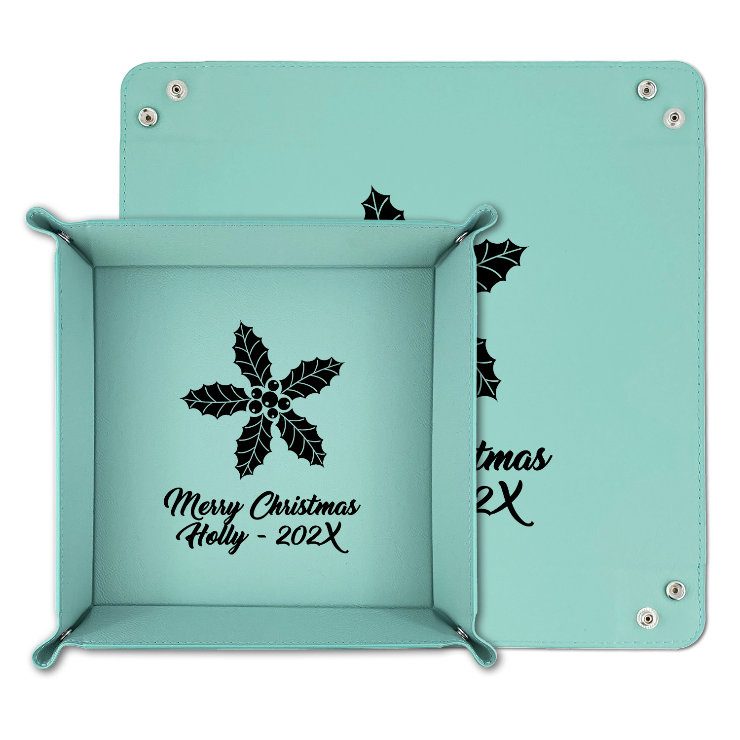 The design is divided into three horizontal parts. The top and bottom are a beautiful green holly background and the middle has a subtle red ornaments background. The middle section is where your personalization goes. This is a great design idea for Christmas decor or Christmas gifts.