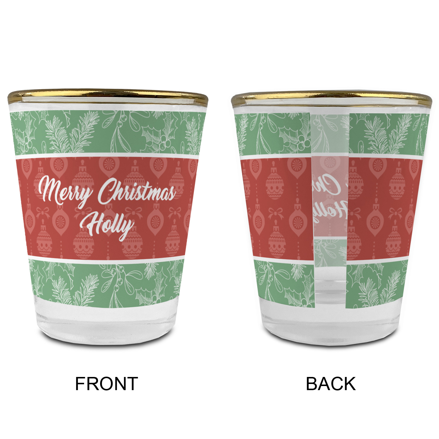 The design is divided into three horizontal parts. The top and bottom are a beautiful green holly background and the middle has a subtle red ornaments background. The middle section is where your personalization goes. This is a great design idea for Christmas decor or Christmas gifts.