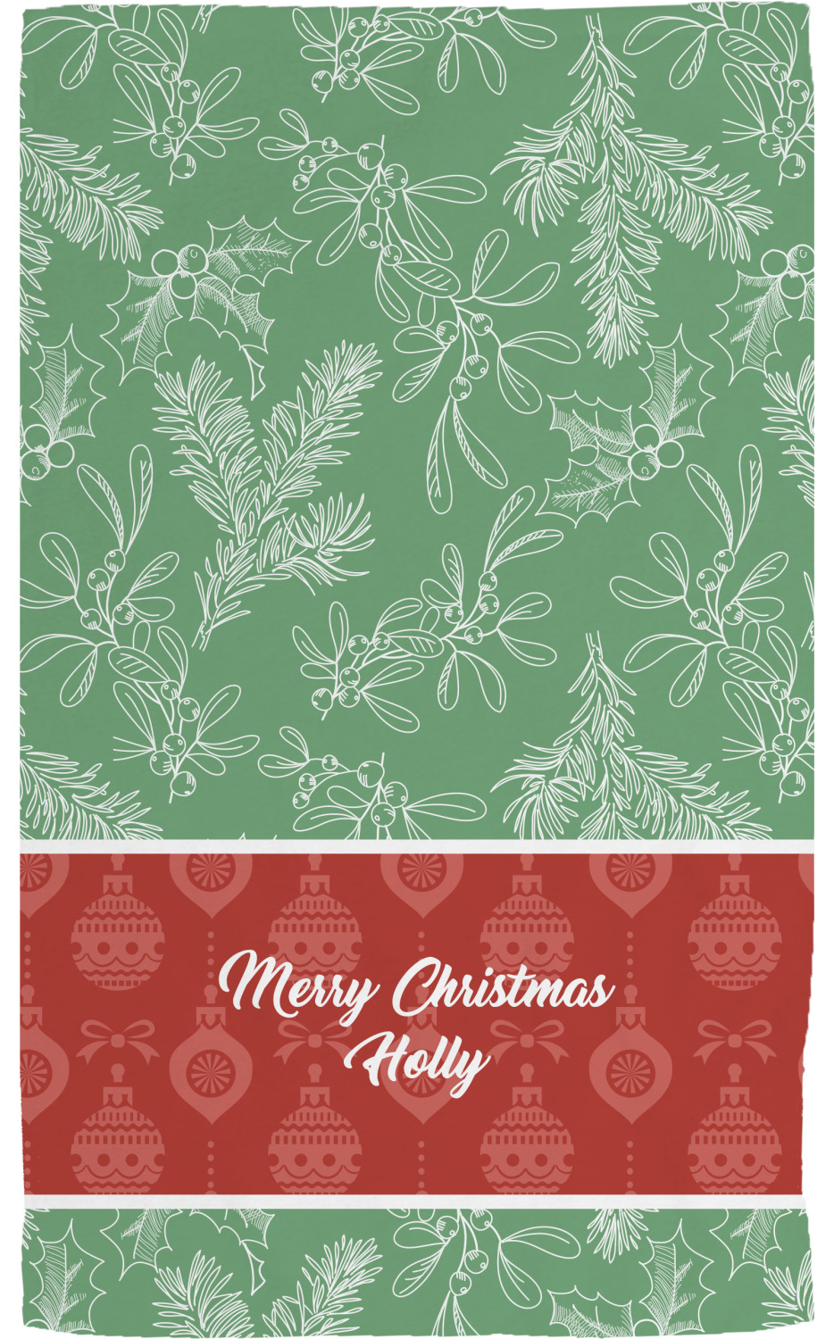 The design is divided into three horizontal parts. The top and bottom are a beautiful green holly background and the middle has a subtle red ornaments background. The middle section is where your personalization goes. This is a great design idea for Christmas decor or Christmas gifts.