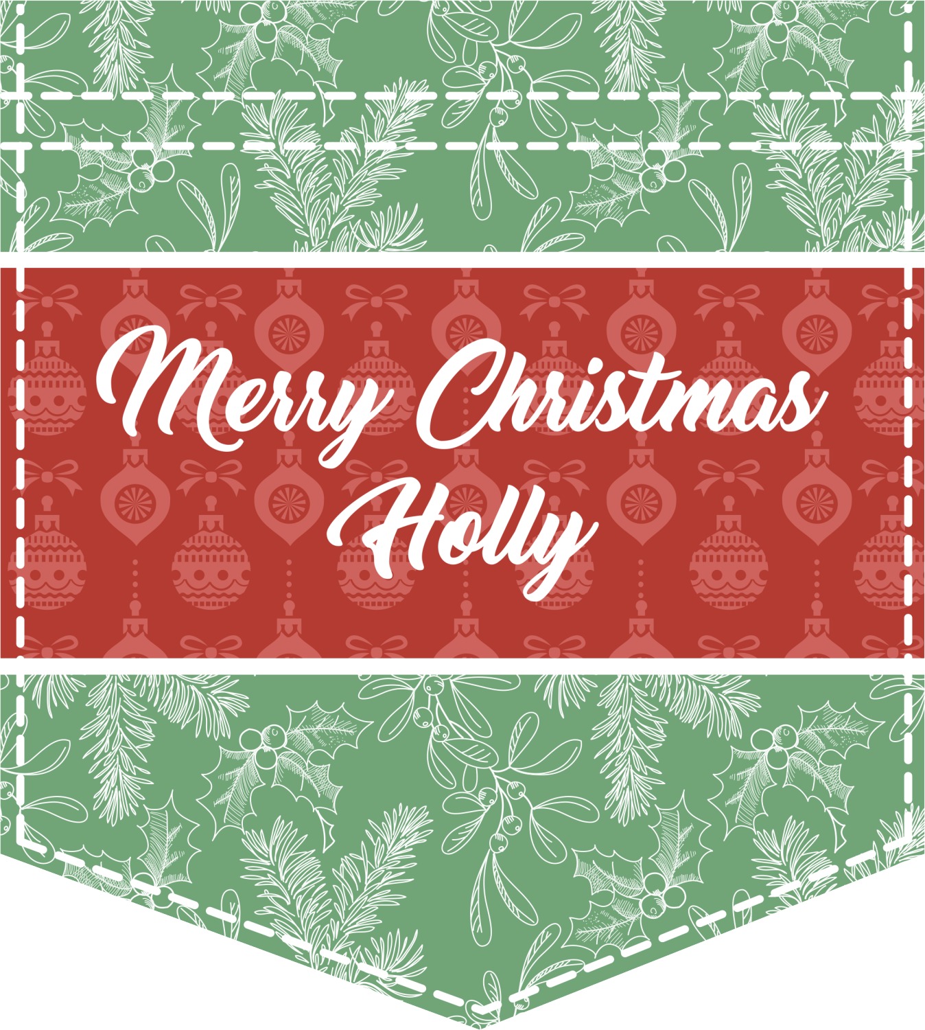 The design is divided into three horizontal parts. The top and bottom are a beautiful green holly background and the middle has a subtle red ornaments background. The middle section is where your personalization goes. This is a great design idea for Christmas decor or Christmas gifts.