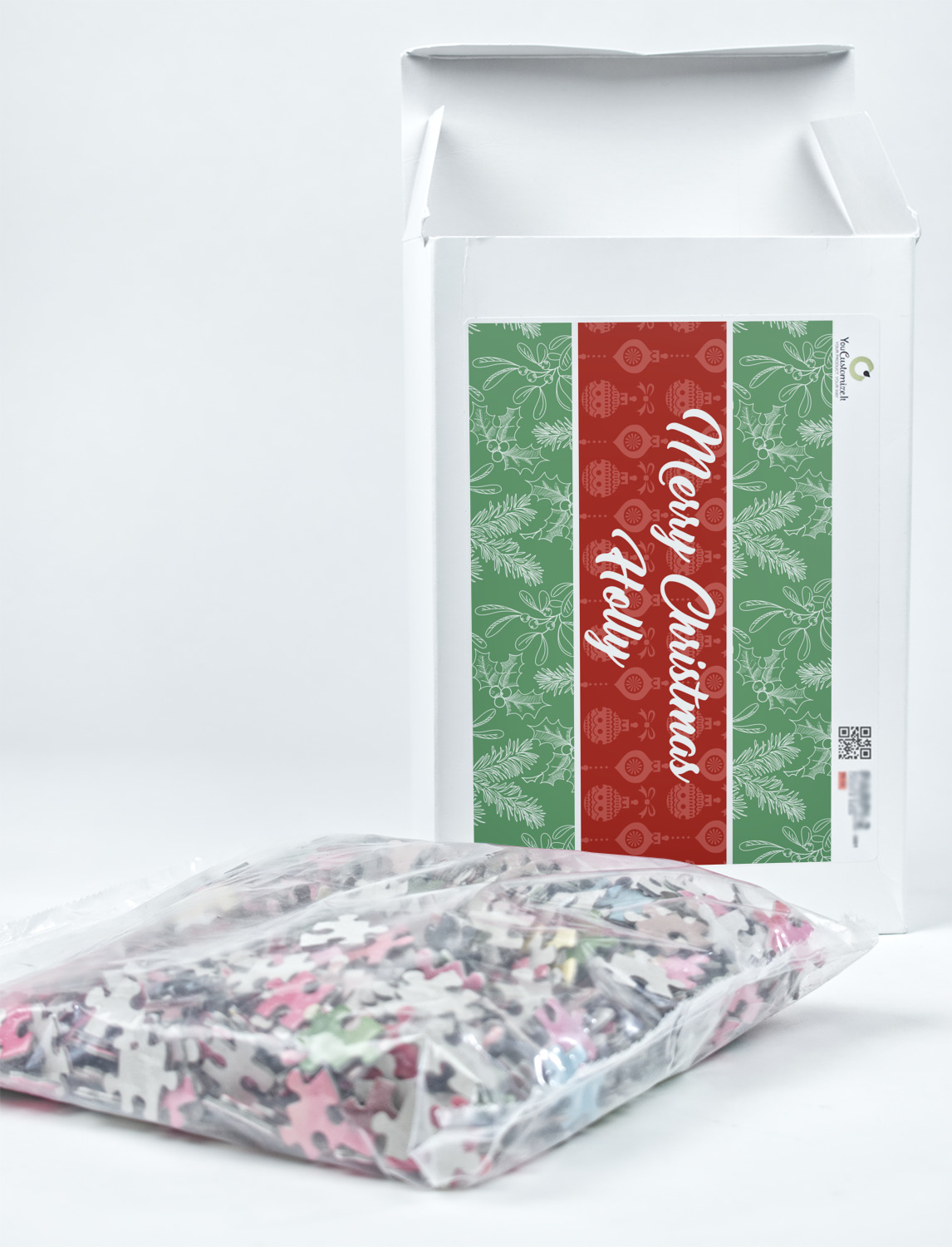 We print our puzzles on thick white chipboard in vibrant colors, then laminate the chipboard and die cut your puzzle. Your jigsaw puzzle is shipped to you in a box with the image of the puzzle on the box.