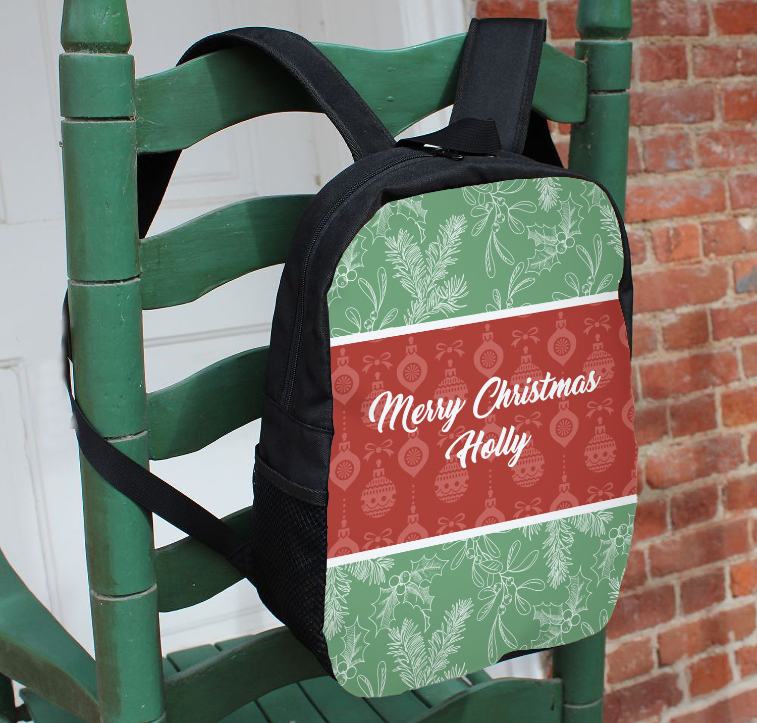 The design is divided into three horizontal parts. The top and bottom are a beautiful green holly background and the middle has a subtle red ornaments background. The middle section is where your personalization goes. This is a great design idea for Christmas decor or Christmas gifts.