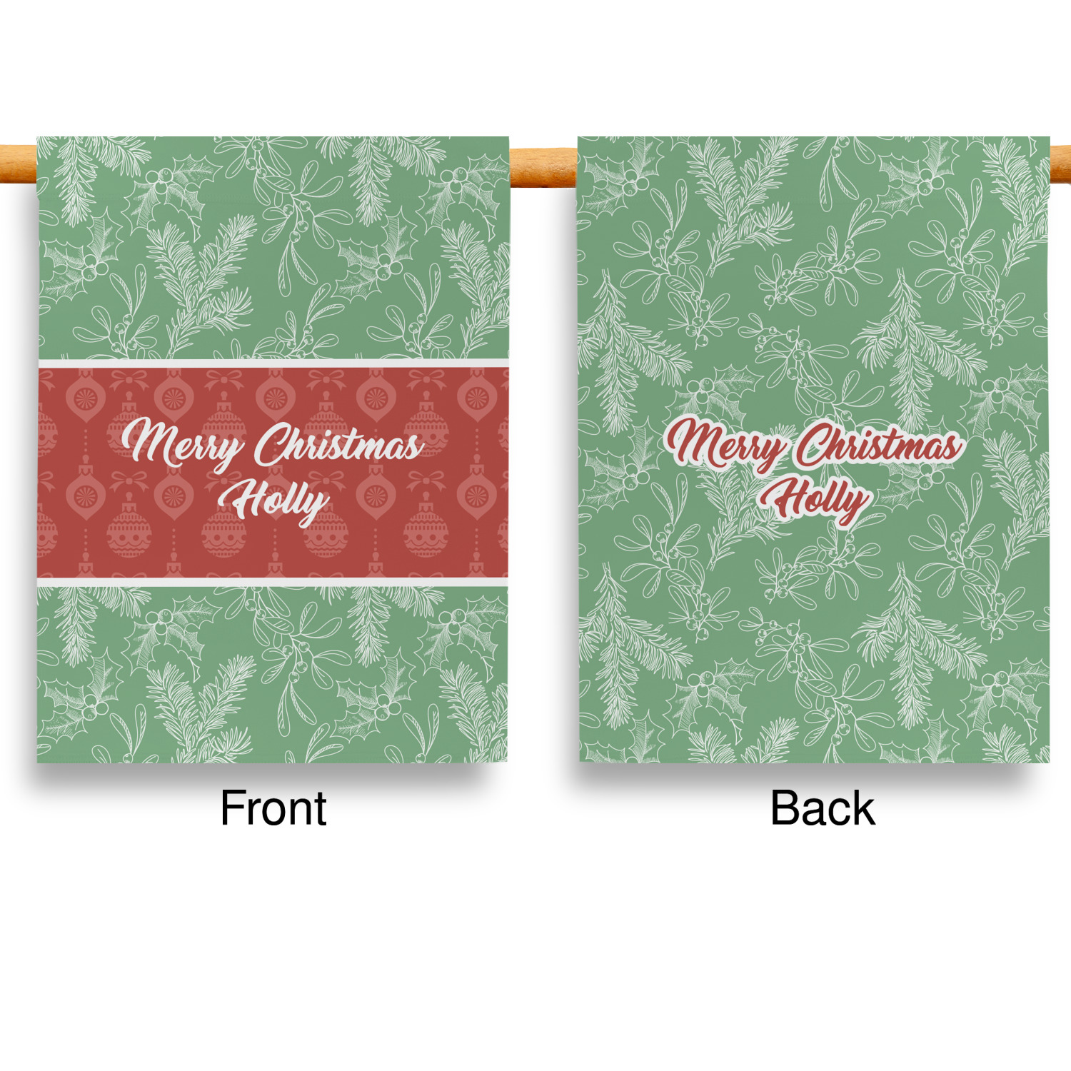 The design is divided into three horizontal parts. The top and bottom are a beautiful green holly background and the middle has a subtle red ornaments background. The middle section is where your personalization goes. This is a great design idea for Christmas decor or Christmas gifts.