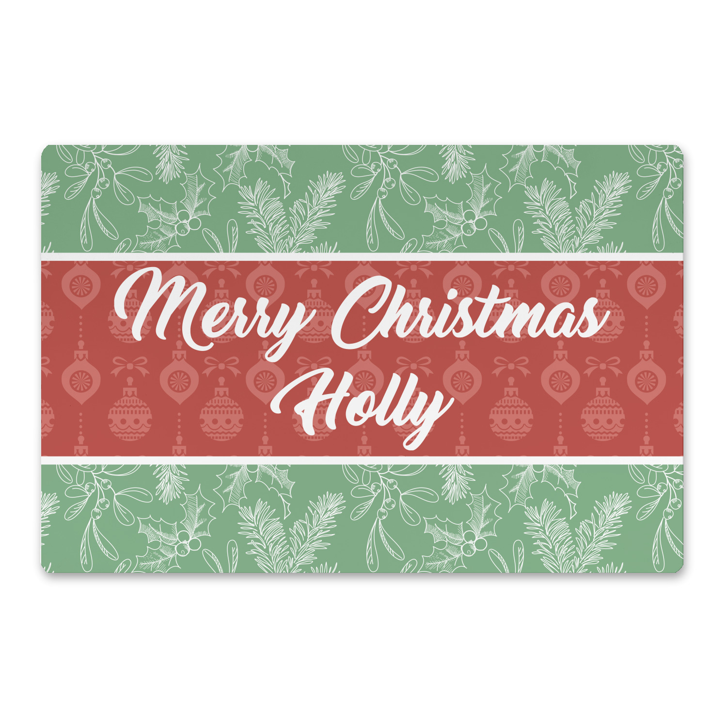 The design is divided into three horizontal parts. The top and bottom are a beautiful green holly background and the middle has a subtle red ornaments background. The middle section is where your personalization goes. This is a great design idea for Christmas decor or Christmas gifts.