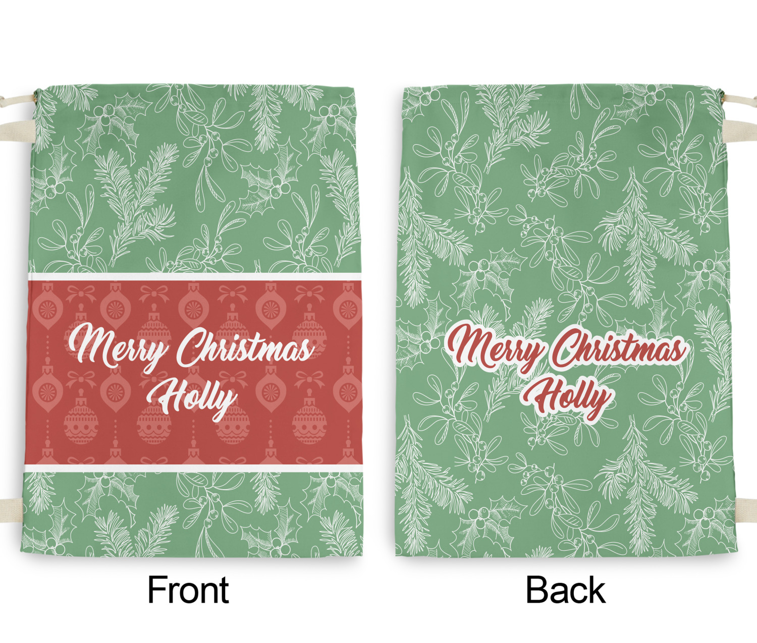 The design is divided into three horizontal parts. The top and bottom are a beautiful green holly background and the middle has a subtle red ornaments background. The middle section is where your personalization goes. This is a great design idea for Christmas decor or Christmas gifts.