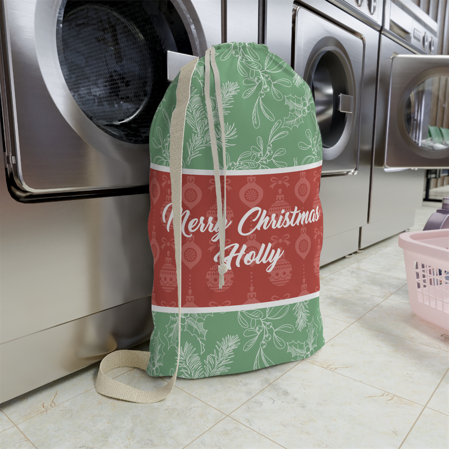 Carry your laundry in style with these customized laundry bags. Available in two sizes, featuring a natural colored woven strap and a cinch cord, these bags hold a lot of clothes or anything else you want to fit in them.