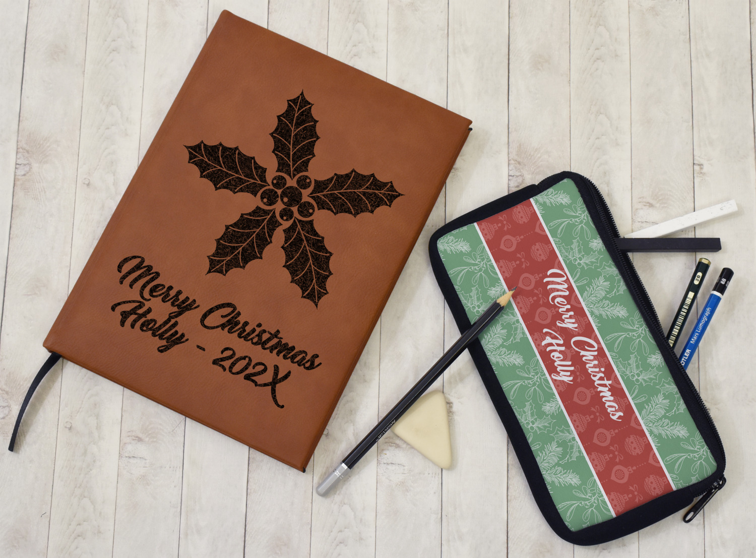 The design is divided into three horizontal parts. The top and bottom are a beautiful green holly background and the middle has a subtle red ornaments background. The middle section is where your personalization goes. This is a great design idea for Christmas decor or Christmas gifts.