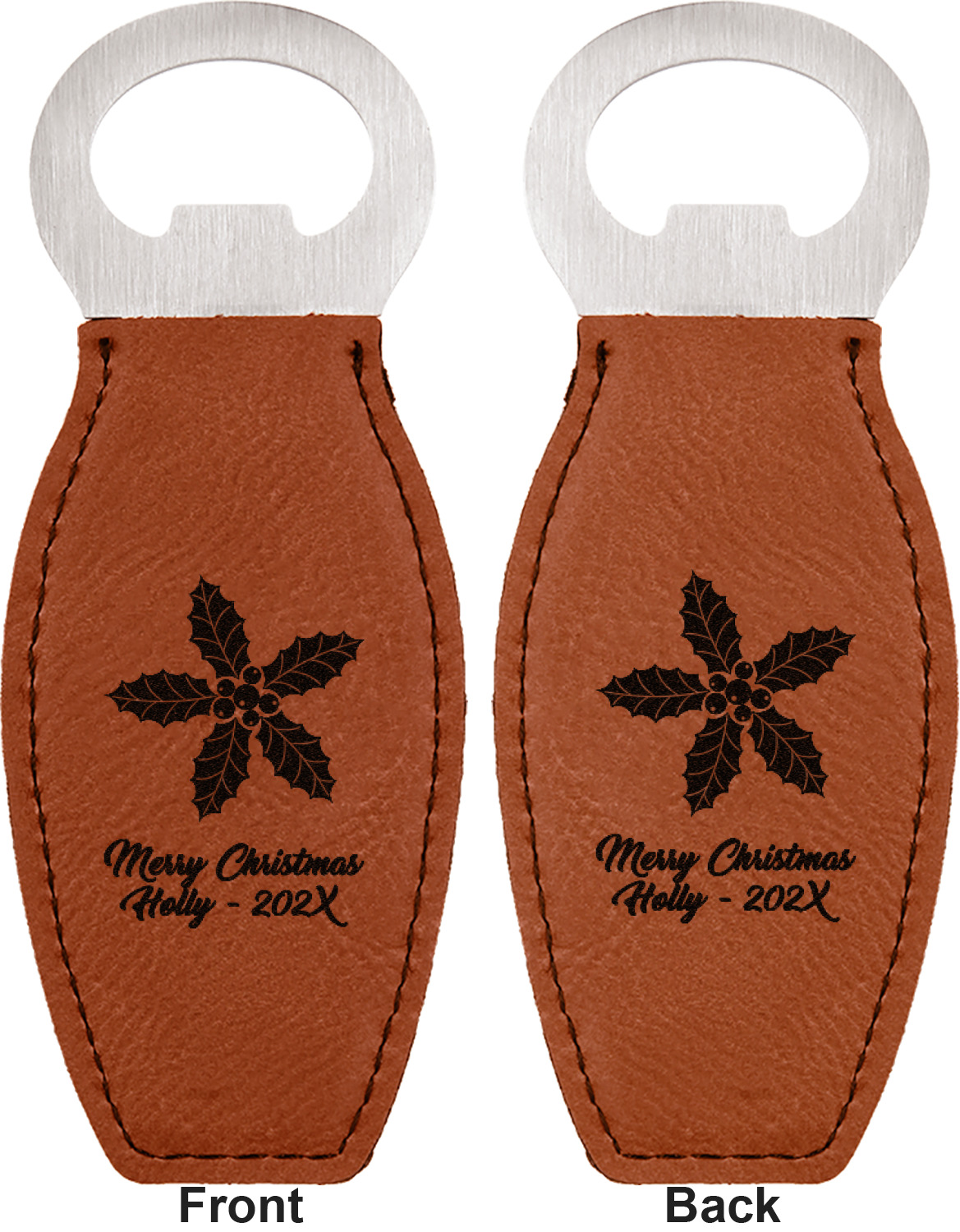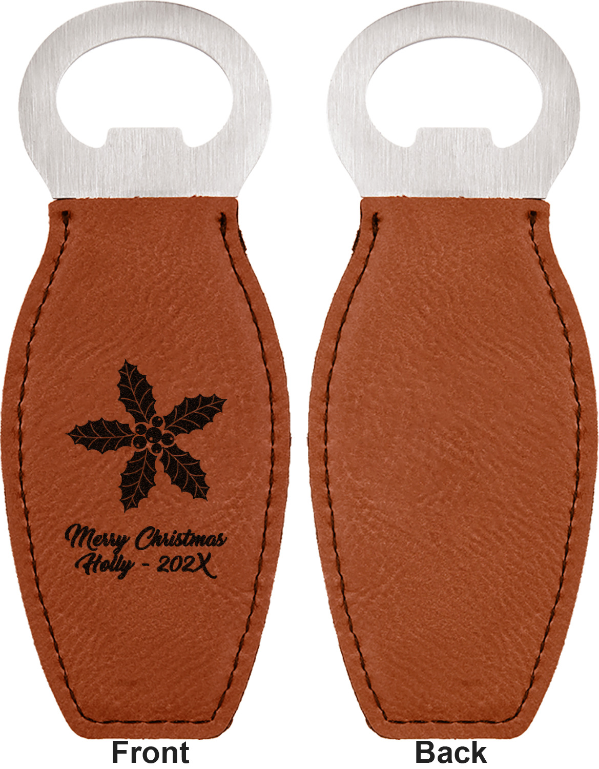 Built from stainless steel, these custom bottle openers are wrapped in a cognac-colored leatherette. Sharp, black stitching lines the edges for extra durability and a finished touch. Your personalization is laser-engraved onto the surface of this leatherette, leaving behind a crisp, black coloration. At 4.6 by 1.8 inches, this beer bottle opener gives you much of leverage when trying to open a stubborn bottle. On the opposite end of the opener, you'll find a magnet that you can use to display your new, unique bottle opener!