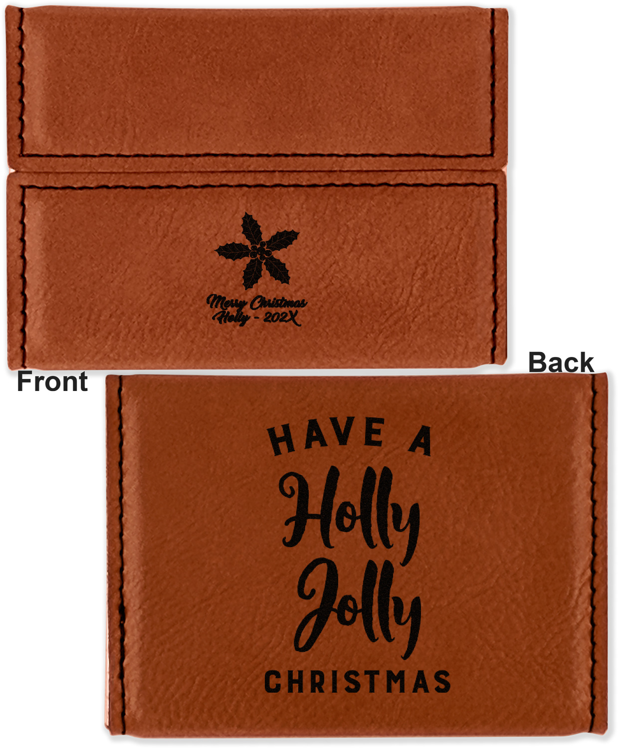 Your personalized design is laser engraved onto either the front, or the front and back of the card holder, depending on the model you purchase. Once engraved, the design will appear a darkened black against the cognac color of the leatherette.