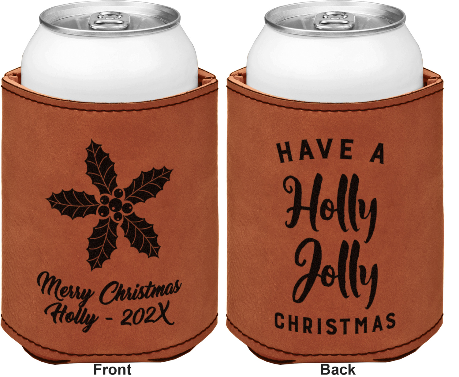 This can sleeve is made from a cognac-brown leatherette and stitched with a sturdy, black thread. A slim padding lines the inside of your can sleeve to allow for a better fit once your drink is inserted. The sleeve itself measures at 4 by 4.5 inches, allowing this custom can sleeve to accommodate most canned drinks. Your personalized design can be engraved on the front and back, or solely the front. When laser-engraved, your design appears as a black coloration which contrasts the leatherette nicely.