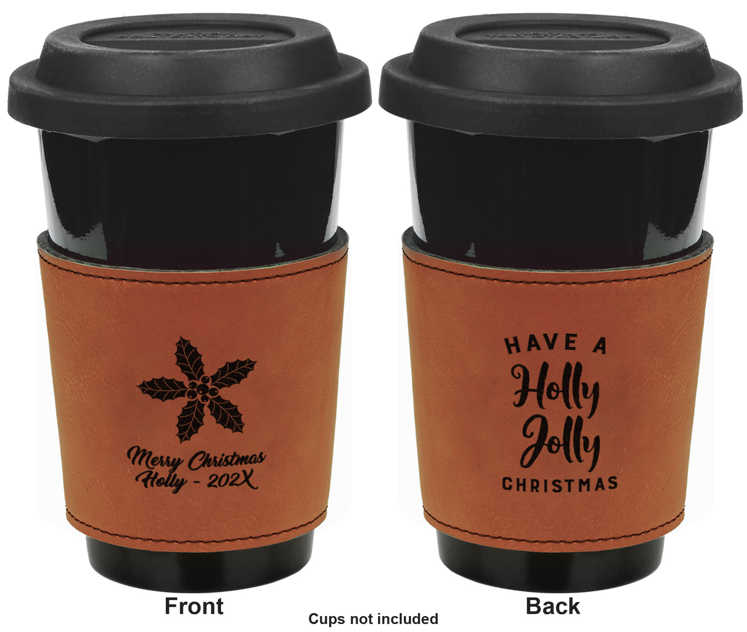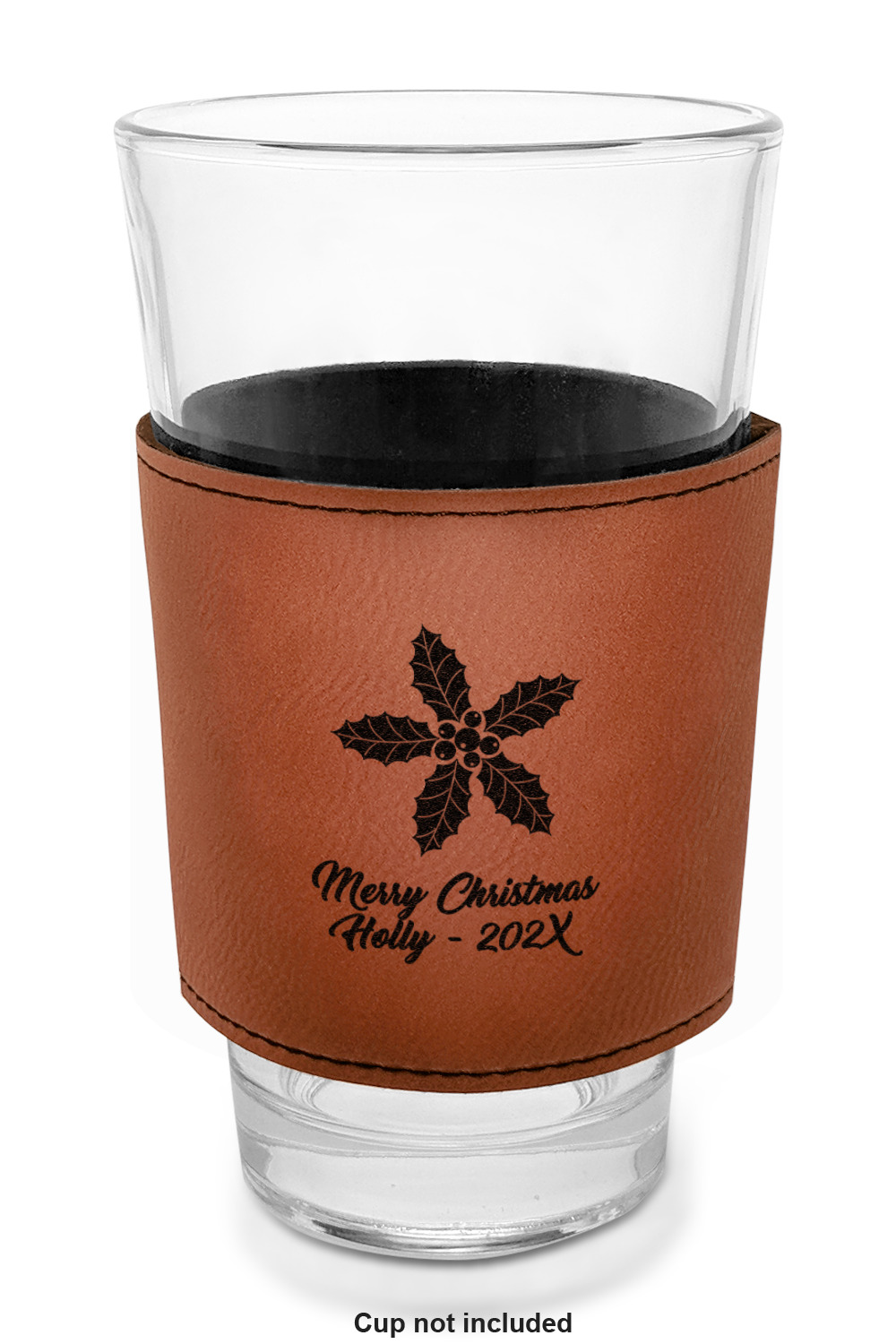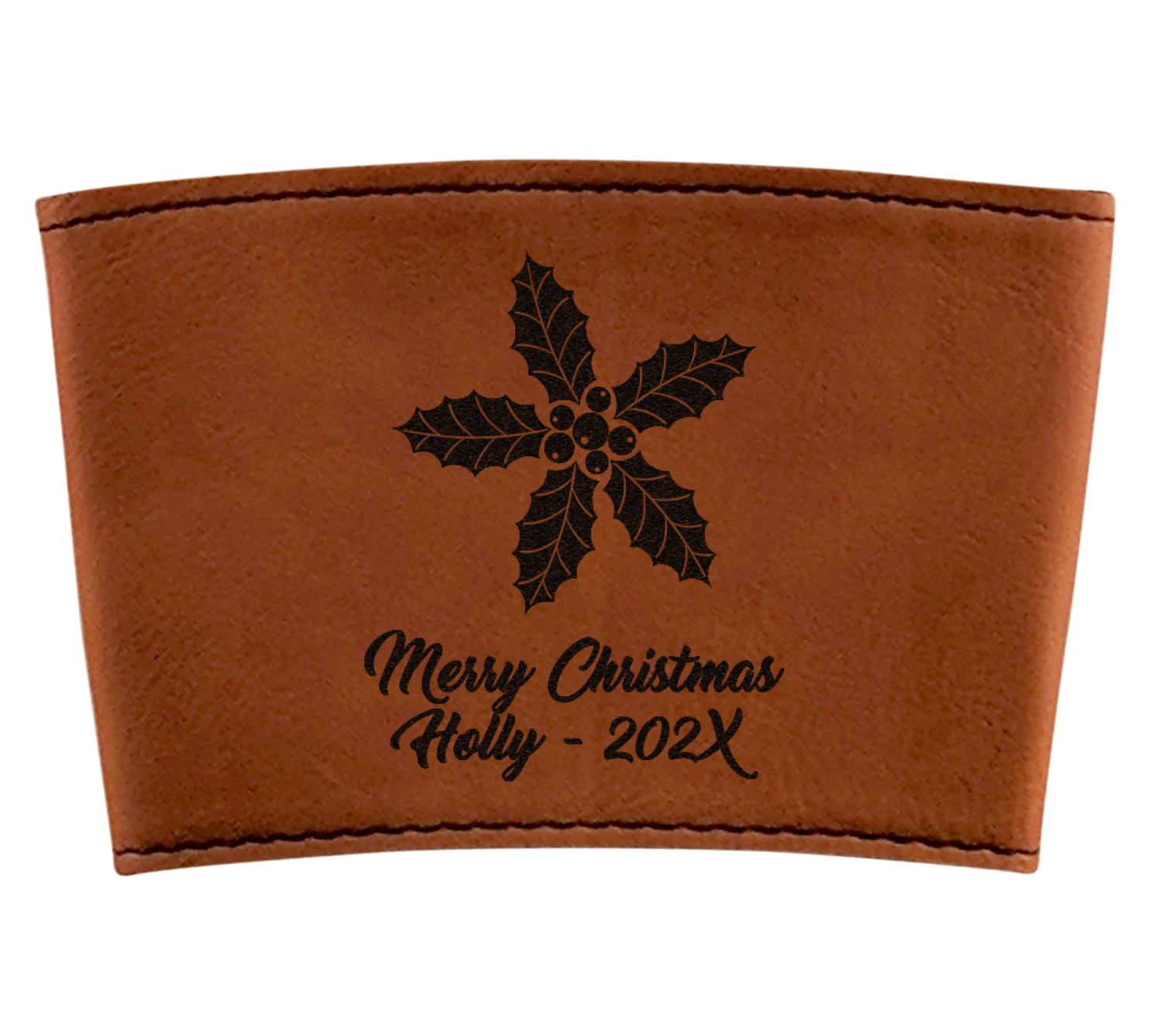This cup sleeve is made from a suave, cognac-brown leatherette and finished with an intricate, black stitch. The interior of this can sleeve is fabricated from a thin foam material to help insulate your mug's contents. The sleeve is specifically made to suit tapered glasses or mugs, so the top's diameter is 3.5 inches, while the bottom's diameter is 2.75 inches. Your customized design will be laser engraved into the leatherette, leaving behind crisp, black imprint. With these products, we provide you with the option of engraving the front and back, or the front only.
