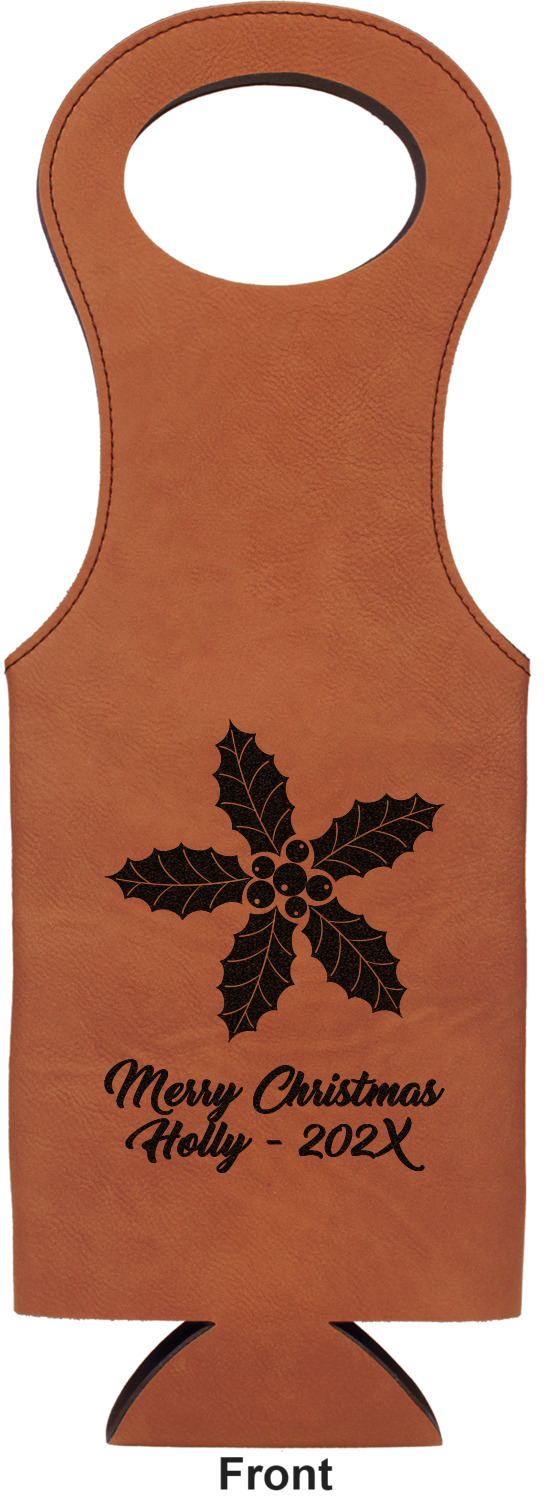 This wine carrier is made from a stunning leatherette, in a cognac-brown color. Strong, black stitching lines the sides of your wine bottle bag and provides extra durability. The interior is lined with a padded, black material to allow for a snug fit once your bottle is placed inside. At the top of this wine gift bag, you'll find two oval shaped handles that elegantly complements the rest of the bag's style. We provide you with the option of laser-engraving the front, or the front and back of your new personalized wine bag!