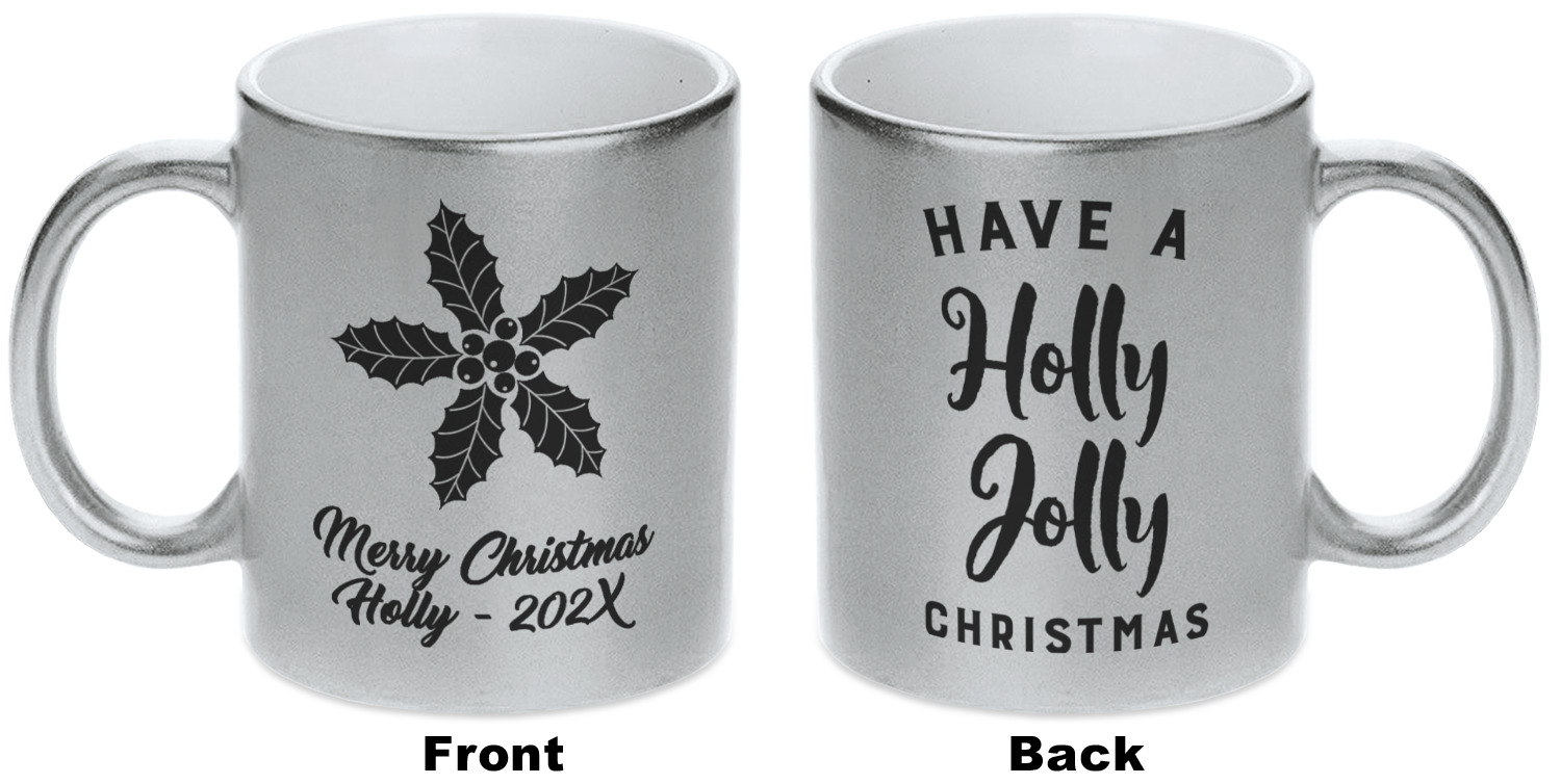 Our custom mugs are ceramic, which is great for keeping your tea or coffee warm! We offer two metallic mugs to personalize - Silver or Gold. Both styles hold around 11oz and have dimensions of approximately 3.75" x 3.5" x 4.75". Both the metallic mugs come in a matte finish and have glitter detailing to add a more pristine feel to the gold and silver base colors.
