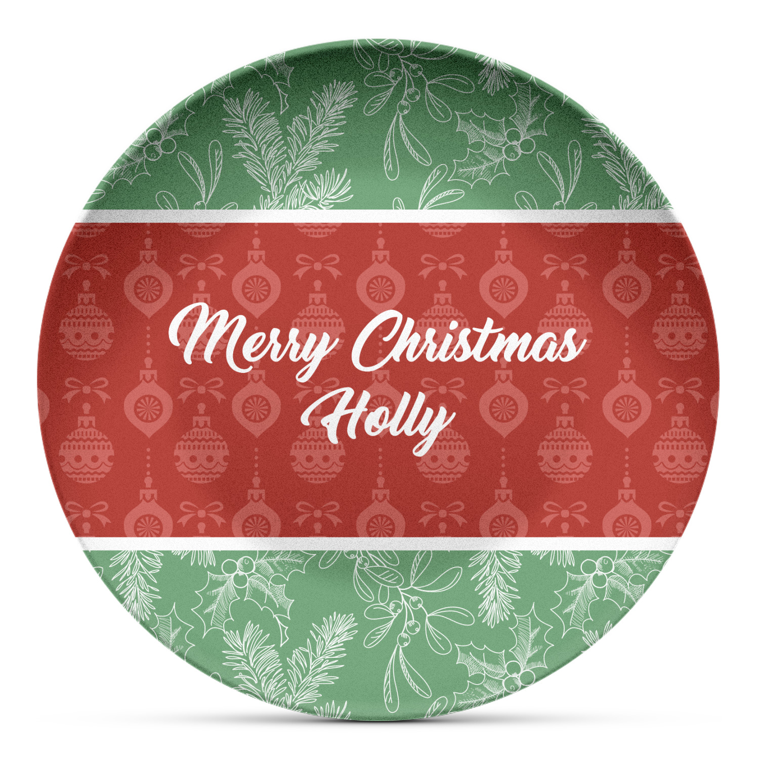 The design is divided into three horizontal parts. The top and bottom are a beautiful green holly background and the middle has a subtle red ornaments background. The middle section is where your personalization goes. This is a great design idea for Christmas decor or Christmas gifts.